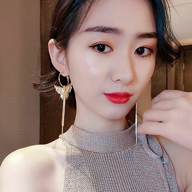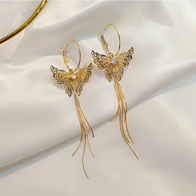 商品説明ピアス S925針 ゴールド 大ぶり 蝶 バタフライ ロング タッセル ラインストーン レディース 韓国 エレガント キラキラ 綺麗 大人 アレルギー 対策 防止