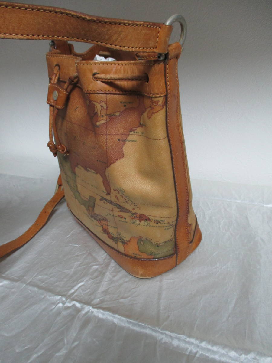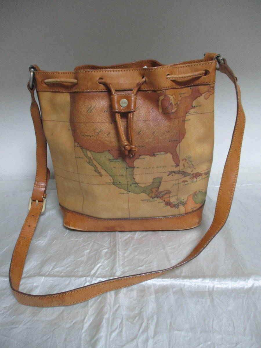 | 商品紹介 | プリマクラッセ定番の地図柄バッグです。 ベージュから茶系の色合いです。 斜め掛け出来る形で、入れ口は紐で開閉するようになっています。 内側はメインの物入れの他、背面側に1か所、 ファスナー付きポケットが付いています。  |