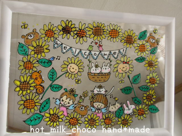 ★NO.A44★ステンドグラス風・A4サイズ・向日葵・ひまわり・花・妖精・女の子・うさぎ・インテリア・飾り・イラスト・ハンドメイド・絵