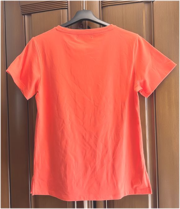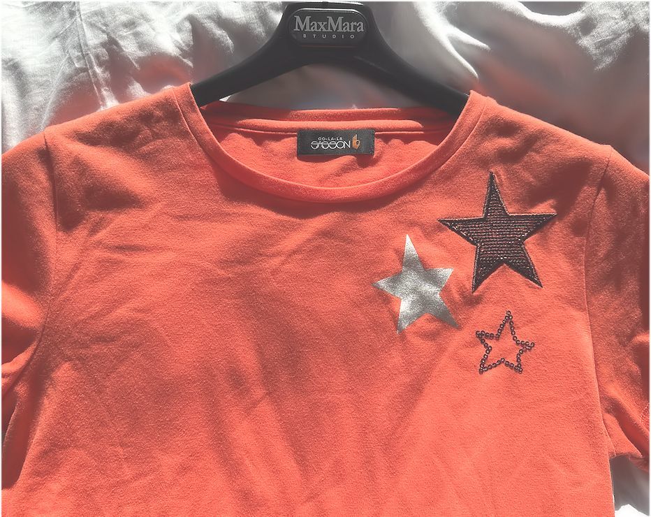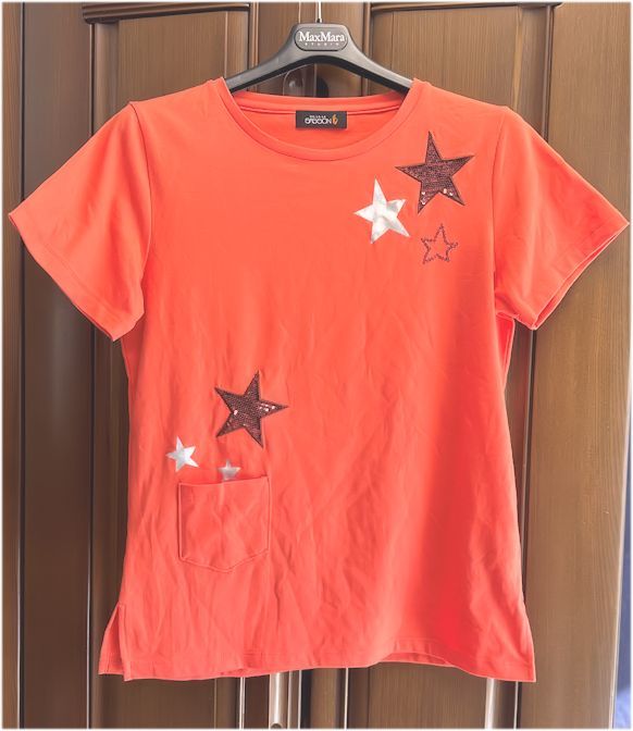 ◎スパンコールを敷き詰めたりシルバーの光沢プリントがきらめくスターがポイントの、素敵なデザイン・カットソーです。綺麗なオレンジ色で顔映りも良く、ポリエステル×コットン混紡素材のため皴にもなり難くていいですよ。大変気に入っておりましたが収納の関係で迷った末の出品です。如何でしょう★