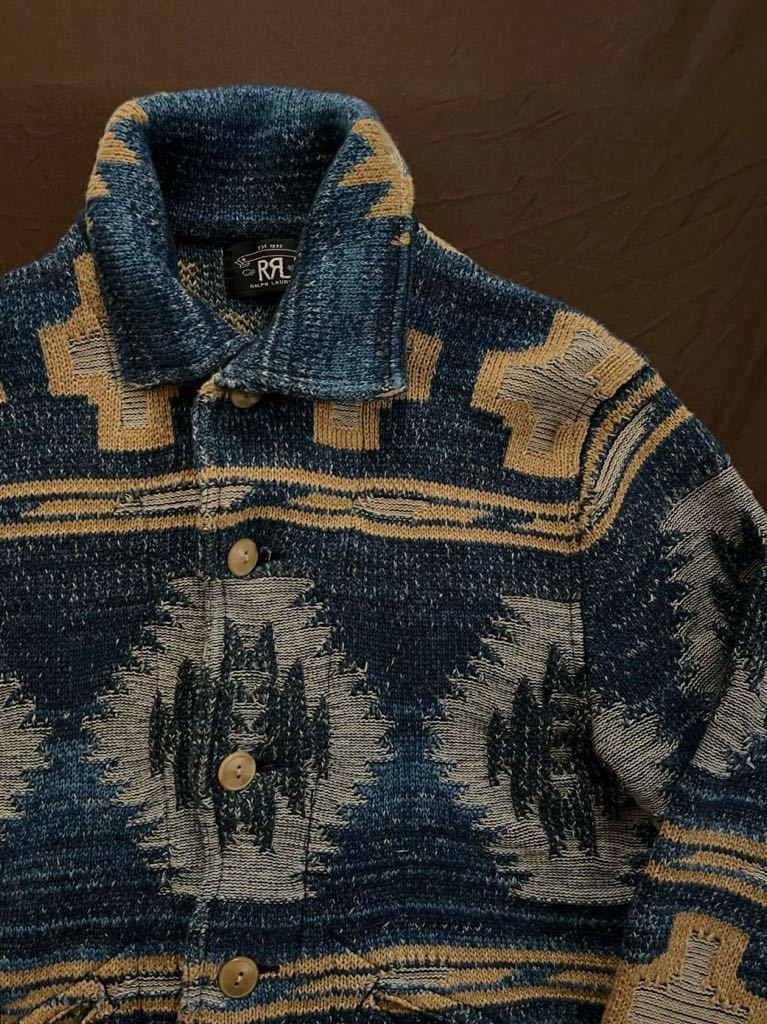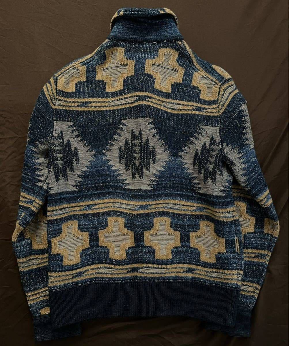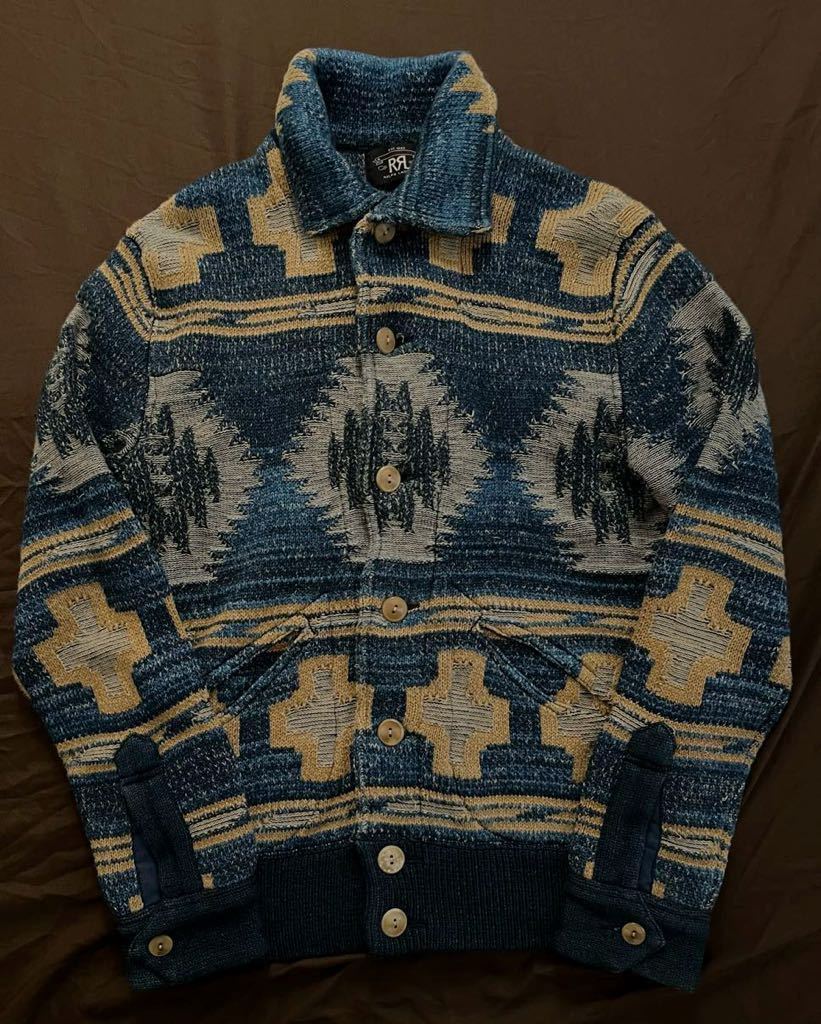 極めて上質なインディゴ染めの生地から成るニットの重量感、幾重にも配されたインディゴヤーン、主張しすぎていない織り柄、そして何といってもA-1スタイルの美しいフォルムで名作ひいてはRRLのネイティブ物を代表する一着。