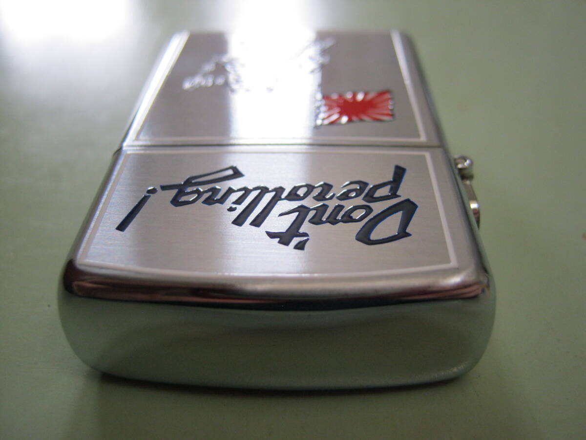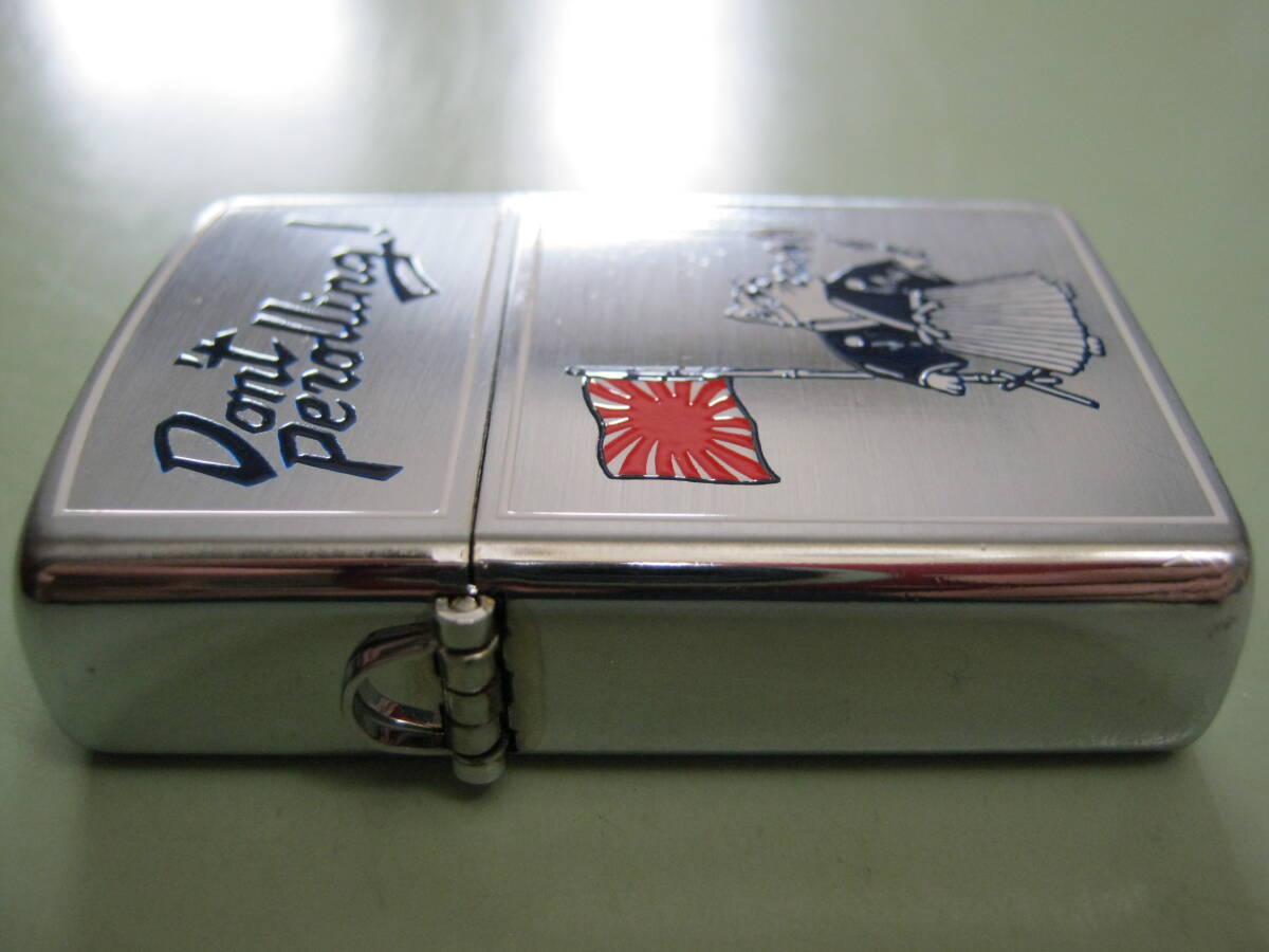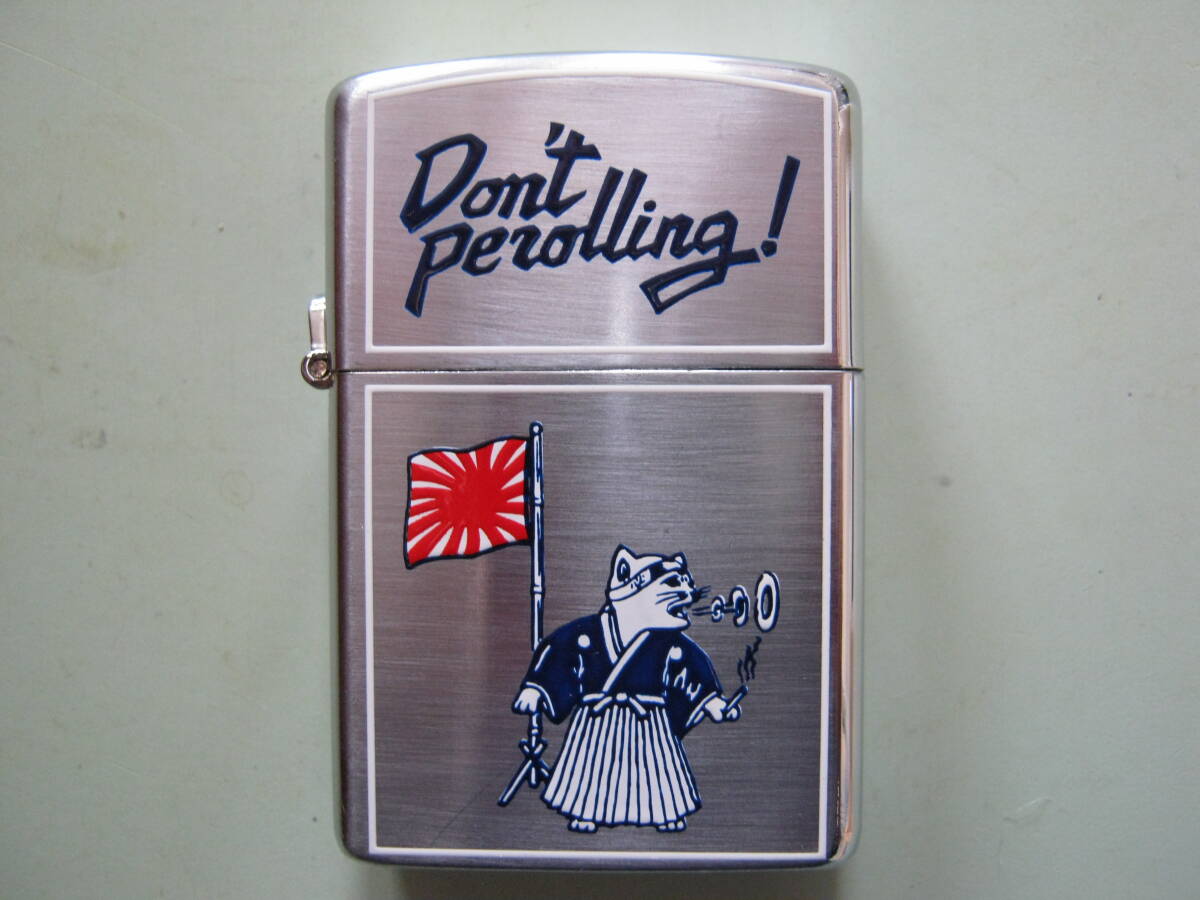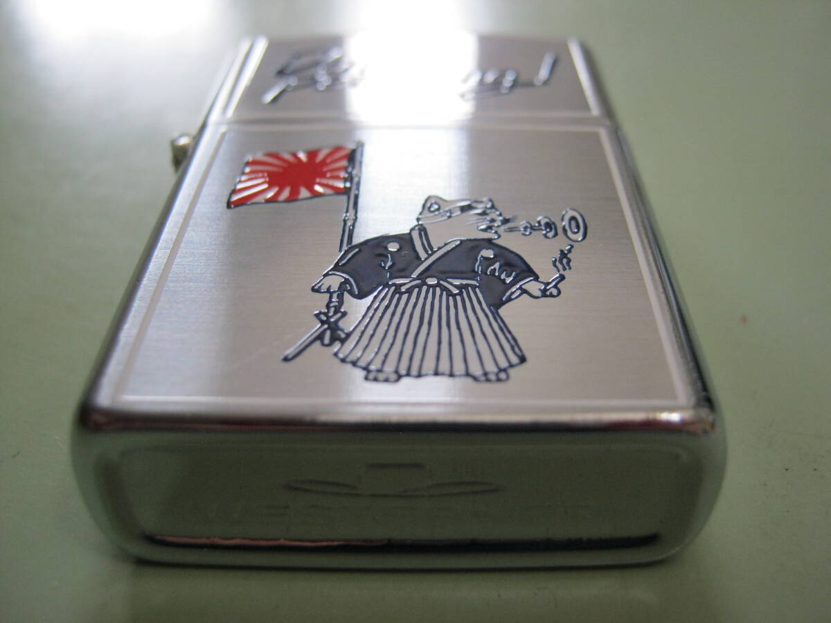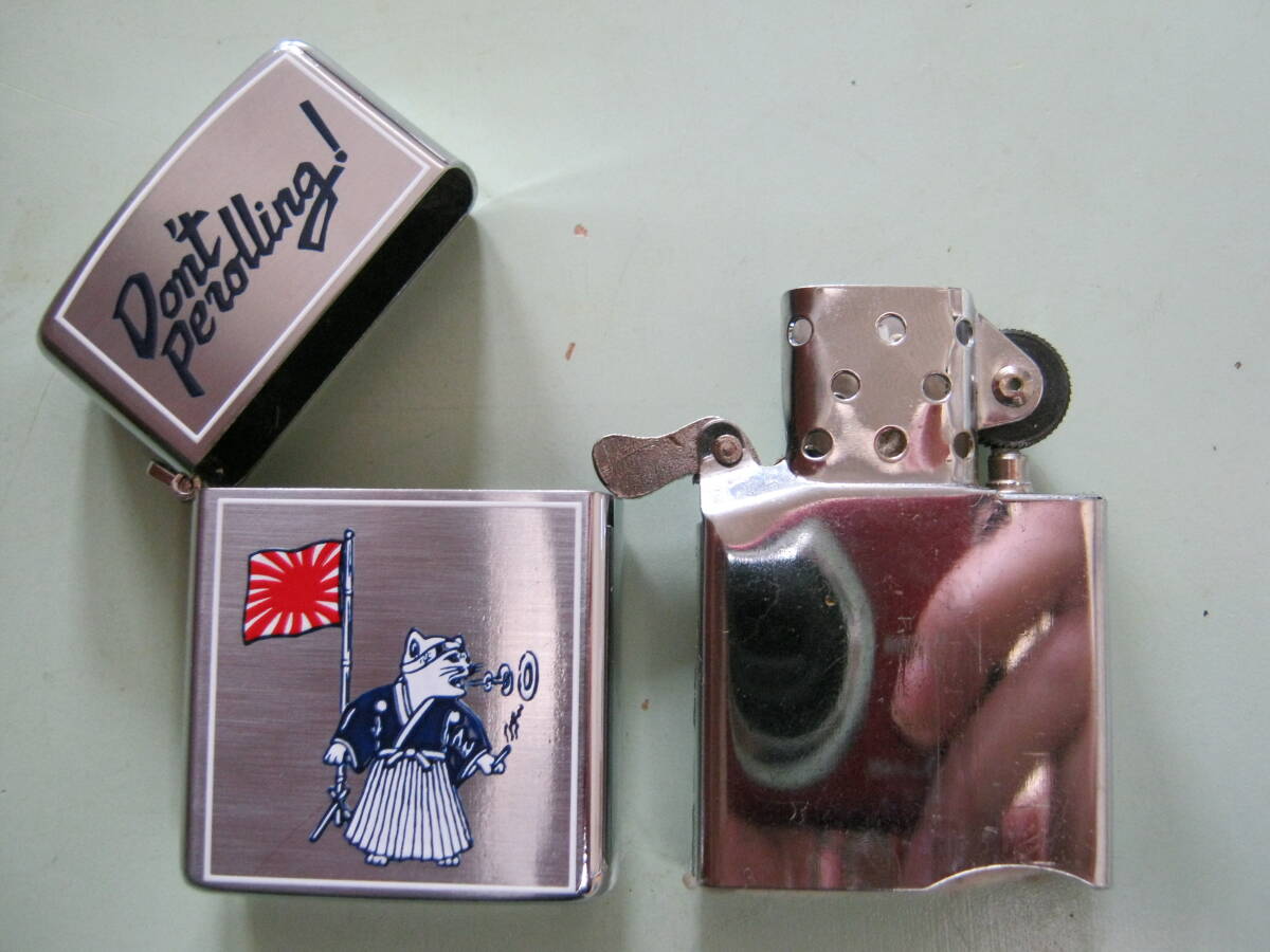 【旭日旗の旗の下で頭に必勝の文字の付いた鉢巻をして紋付羽織袴の猫がたばこをふかす絵が付いたオイルライター(未使用品)1970年代】②