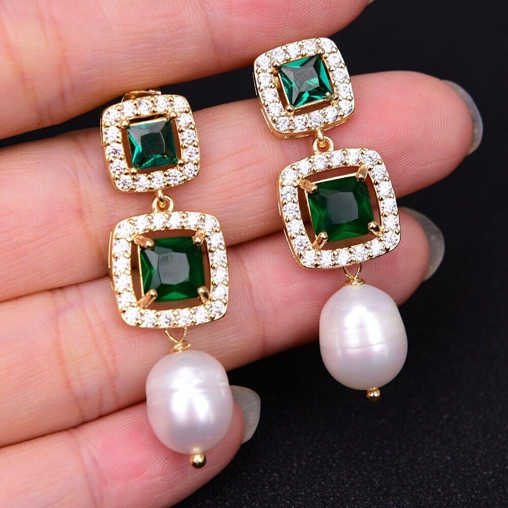 <新品>ホワイト 淡水養殖 パール 真珠 グリーン クリスタル スタッド ピアス ダングル ロング 結婚式 ダンス プレゼント パーティー a
