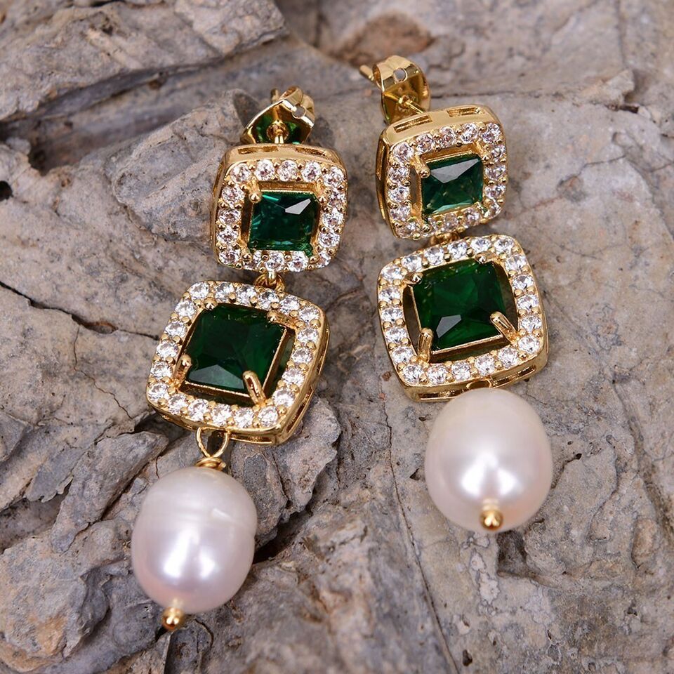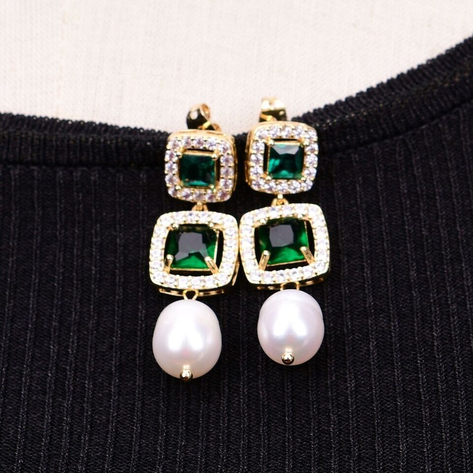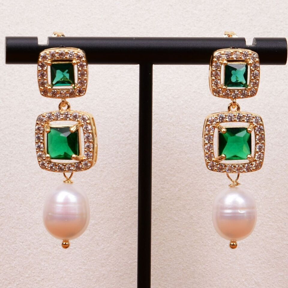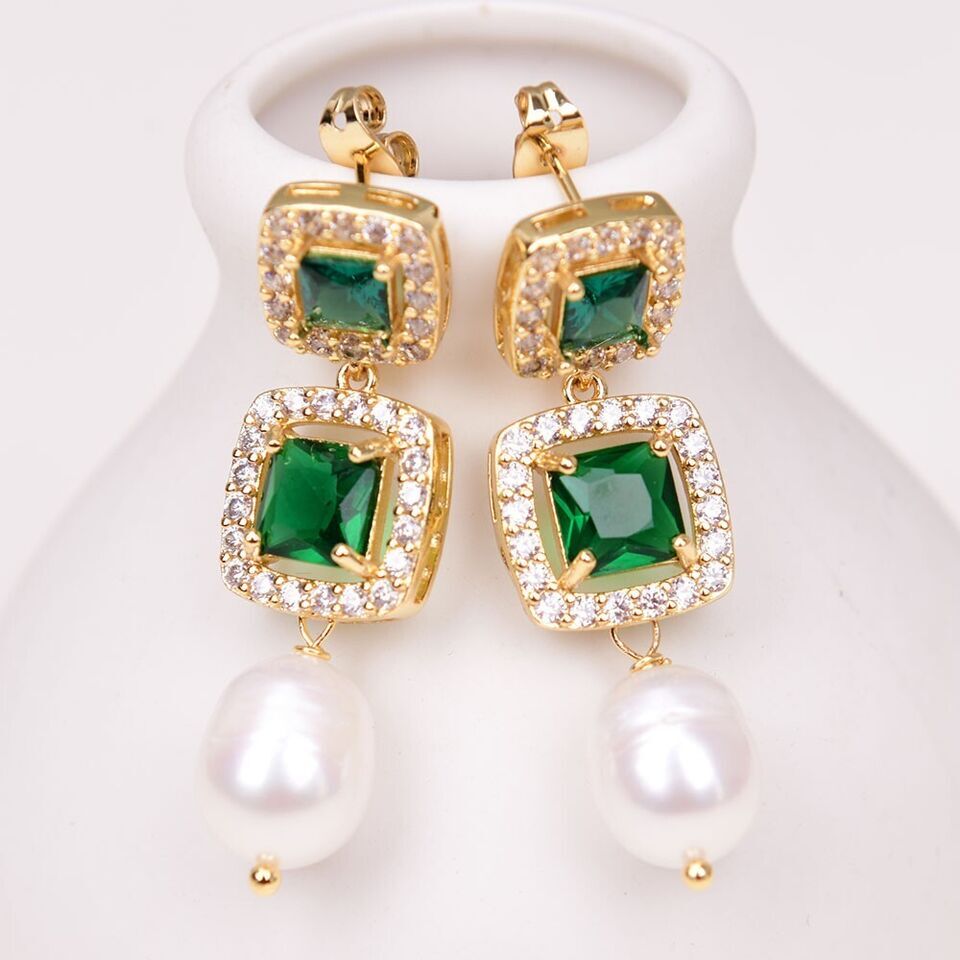 素材: 淡水養殖 パール(13x10mm)、グリーン クリスタル、キュービックジルコニア、ゴールドプレーティッド