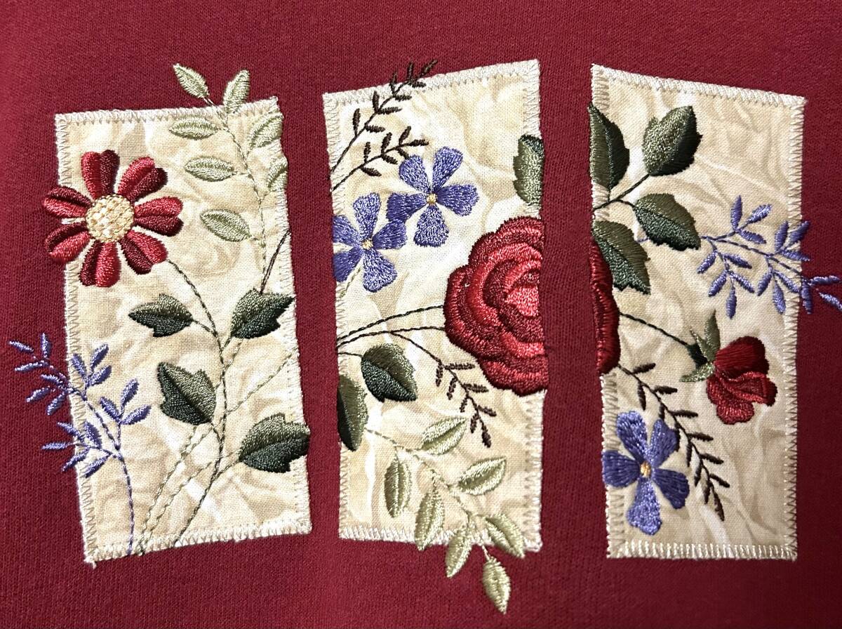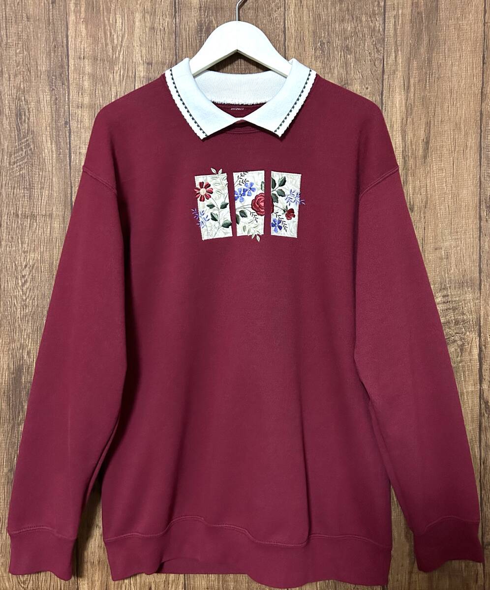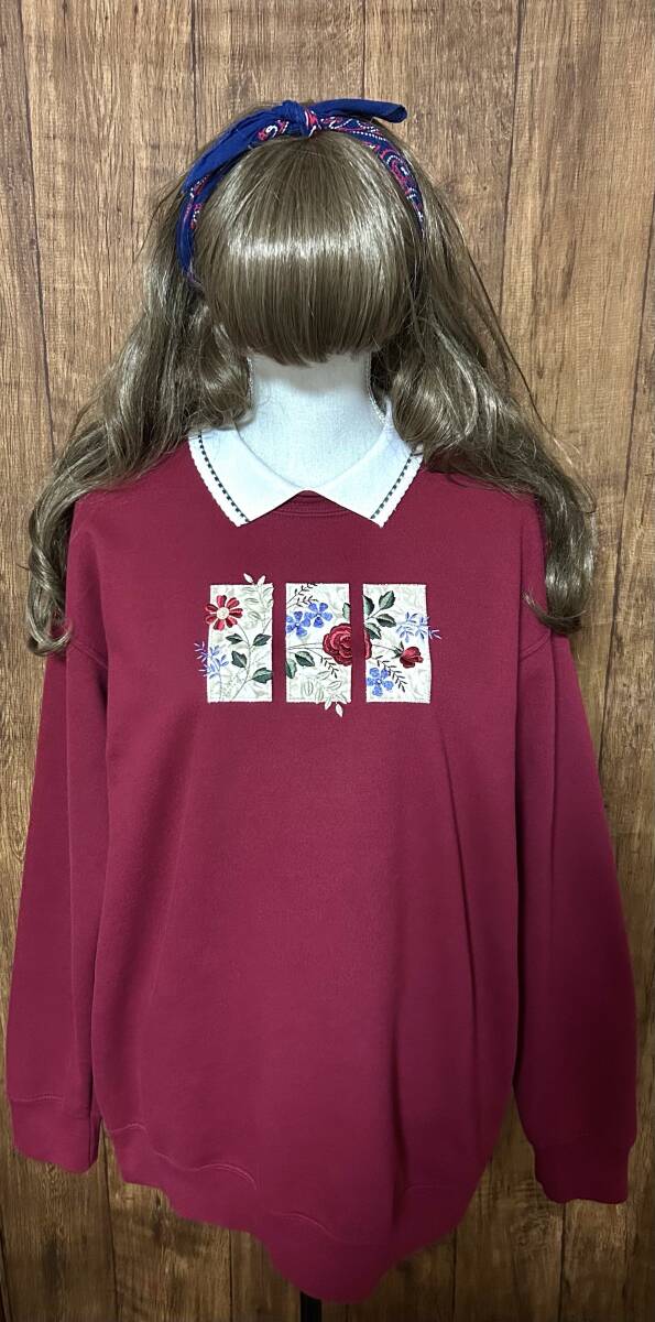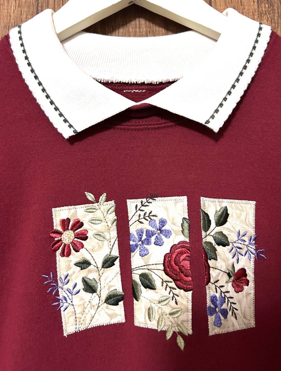 えんじ色の生地にお花の刺繍がパッと目をひく