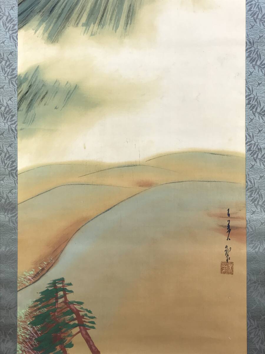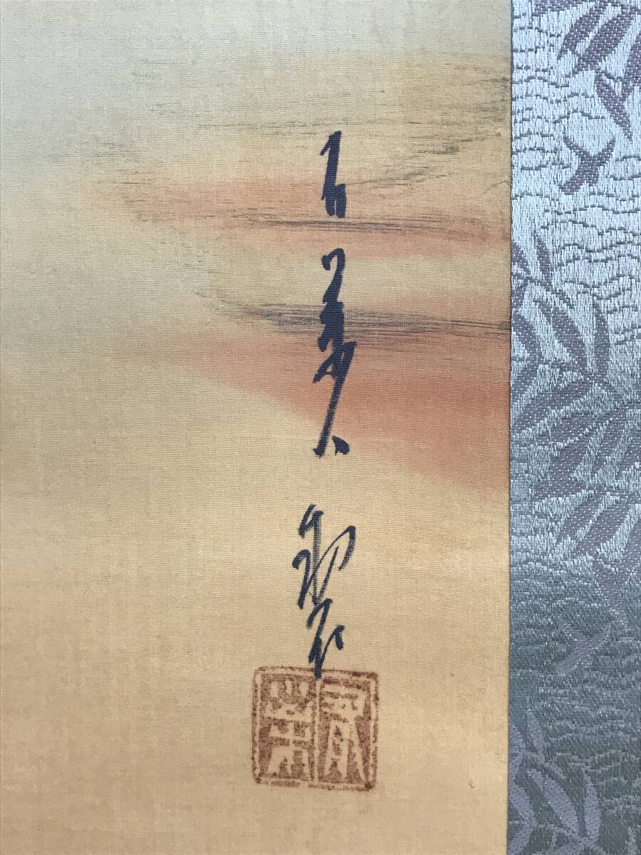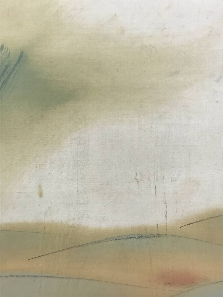 【作品状態】 本紙は絹本肉筆です。本紙は薄汚れ、全体に汚れシミあります。表装は天地に多数の汚れシミあります。