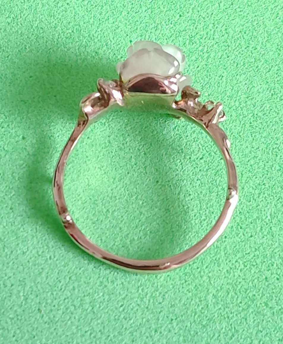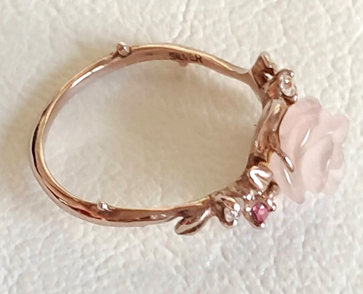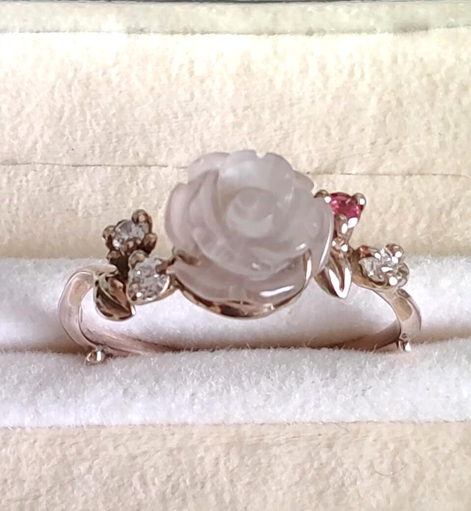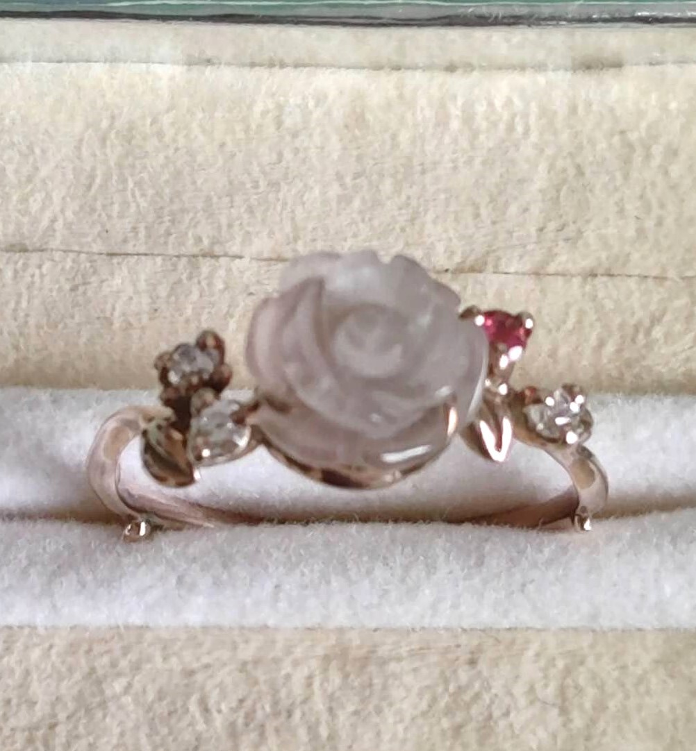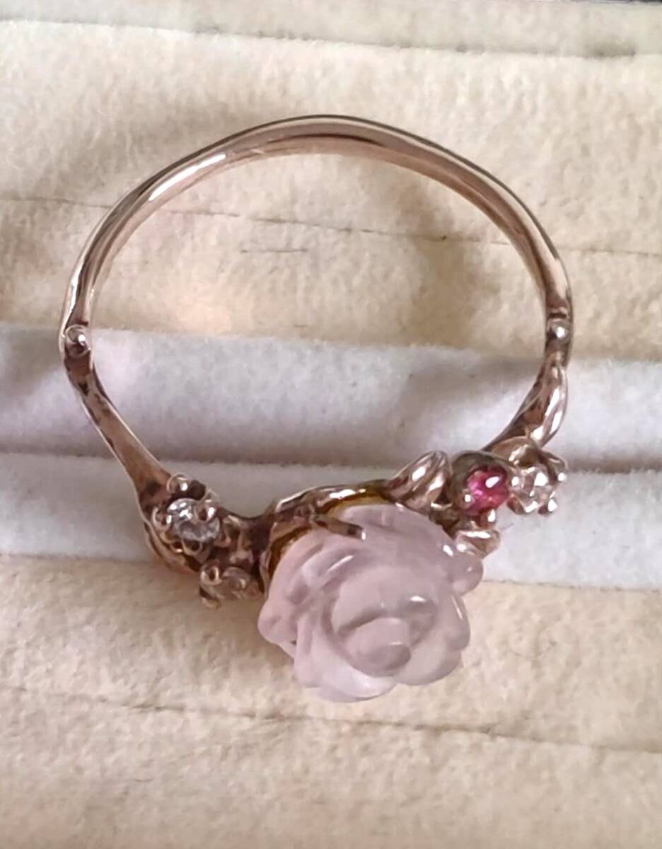 指輪トップ: ローズクォーツ リング フラワー、ダイヤモンド(推測)、ルビー(推測)の飾りあり