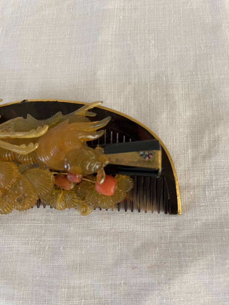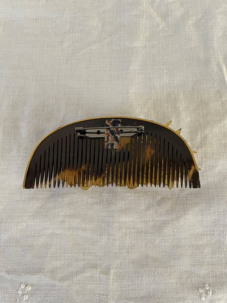 アンティークの櫛を使ったブローチです。櫛の部分は鼈甲で縁は金箔で塗られています。