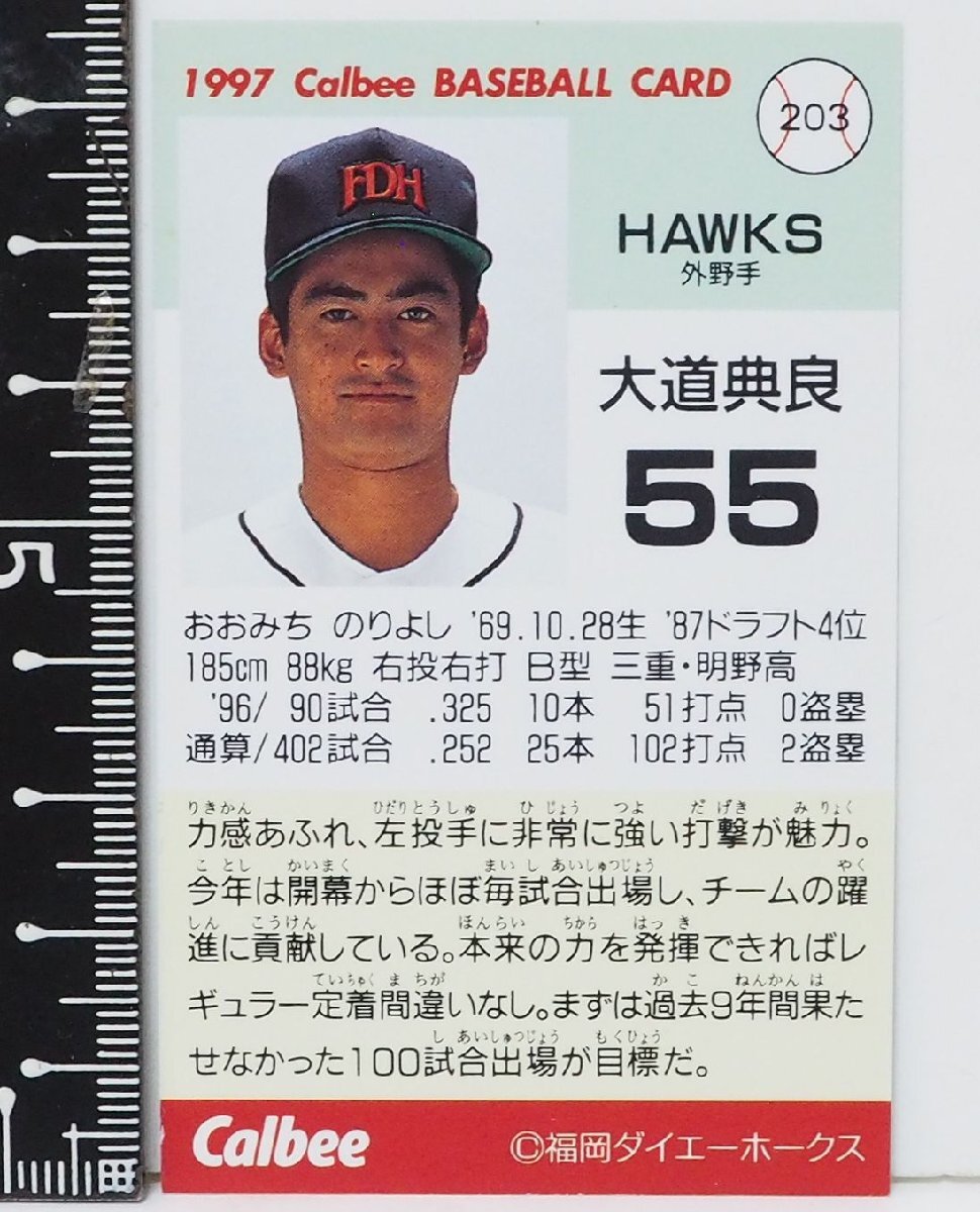 97年 カルビー プロ野球カード 203【大道 典良 外野手 福岡ダイエー ホークス】平成9年 1997年 当時物 Calbeeおまけ食玩BASEBALL【中古】