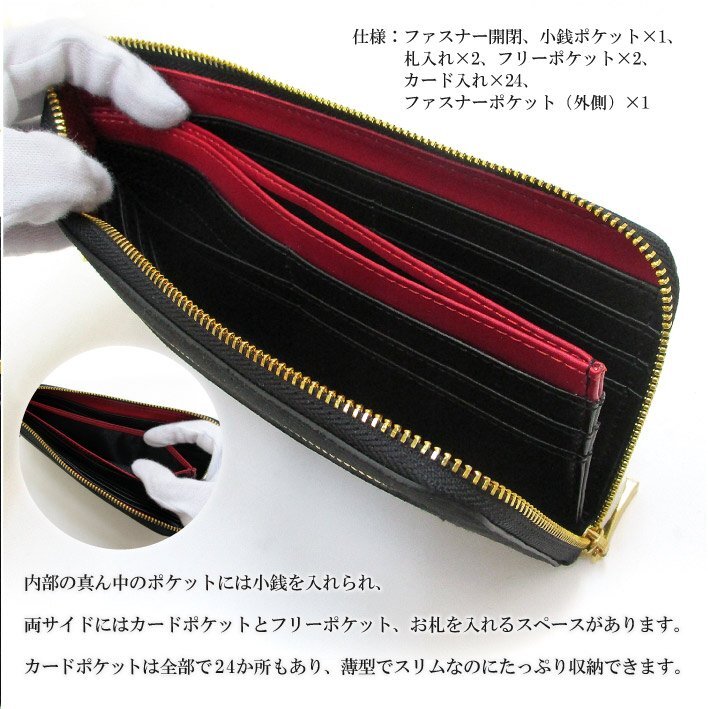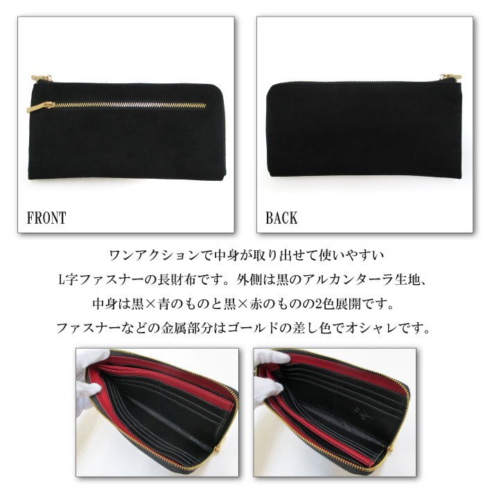 ワンアクションで中身が取り出せて使いやすいL字ファスナーの長財布です。 内部の真ん中のポケットには小銭を入れられ、両サイドにはカードポケットとフリーポケット、お札を入れるスペースがあります。 カードポケットは全部で24か所もあり、薄型でスリムなのにたっぷり収納できます。 表側の素材は、スーパーカーや高級車の内装にも使用されているアルカンターラという、クルマ好きには高級内装素材として知られている人工革です。 スエードに似た高級感ある見た目ですが、より耐久性や耐光性、水もはじきやすく、難燃性が極めて優れていると同時に肌触りの良い素材です。 液体の吸収力が低く、水に濡れても乾けば元通りの風合いを取り戻します。汚れ落としが簡単です。 耐久性に優れているので長年お使いいただけます。人と違ったものを持ちたい方にオススメです。 誕生日プレゼント・クリスマス・バレンタイン・父の日・母の日などの贈り物にも最適です。 外側は黒のアルカンターラ生地、中身は黒×青のものと黒×赤のものの2色展開です。 ファスナーなどの金属部分はゴールドの差し色でオシャレです。 ■カラー:BK/RD ■素材:外側 アルカンターラ、内側 牛革 ■サイズ(約):横21.5cm×縦10.5cm×マチ2cm ■重量:約180g ■仕様:ファスナー開閉、小銭ポケット×1、札入れ×2、フリーポケット×2、カード入れ×24、ファスナーポケット(外側)×1 ※一部共通画像使用 ※ご注意※革は自然が造り出した理想的な繊維です。 自然由来の素材のため革には細かなシワや傷跡・トラ等が存在する場合があります。 これらは本革である証拠であり、革本来の特長であり、魅力でもあります。 ※新品ではございますが製造上の過程により商品によっては細かな傷やへこみ、剥げ等がある場合が御座います。 また、多少の縫製のゆがみ・ノリの付着がある場合がございます。 ※ご覧のモニターやプラウザの設定、照明等により、画像と実物の色合いが、若干異なる場合が御座います。 予めご理解頂いた上でご購入下さい。 | |