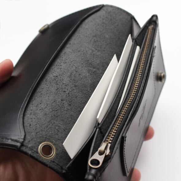 本来のトラッカーズウォレットを活かし、少な目の仕切りながら、マチがあるのでカードも入りやすい作りになっています。