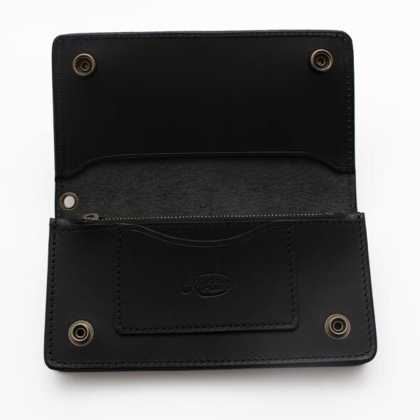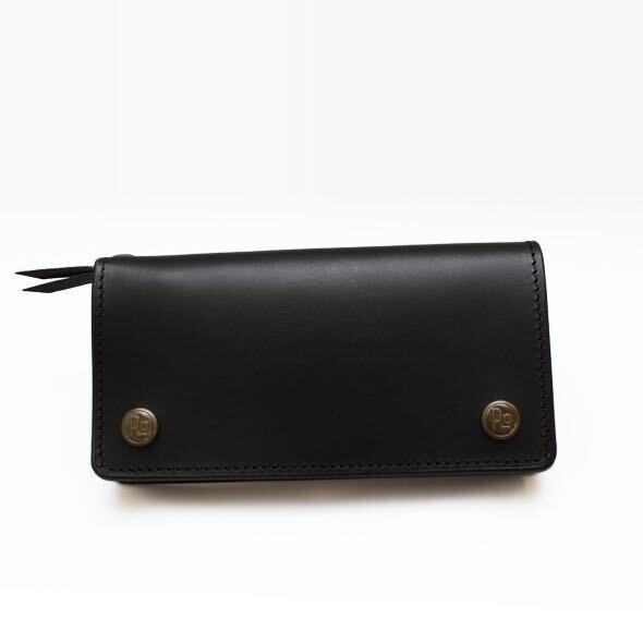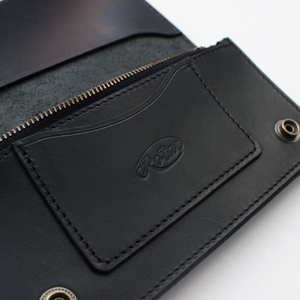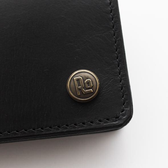 人気のスタッズは敢えて封印し、オリジナルRoドットボタンとロゴの型押しを施したシンプルなウォレットです。