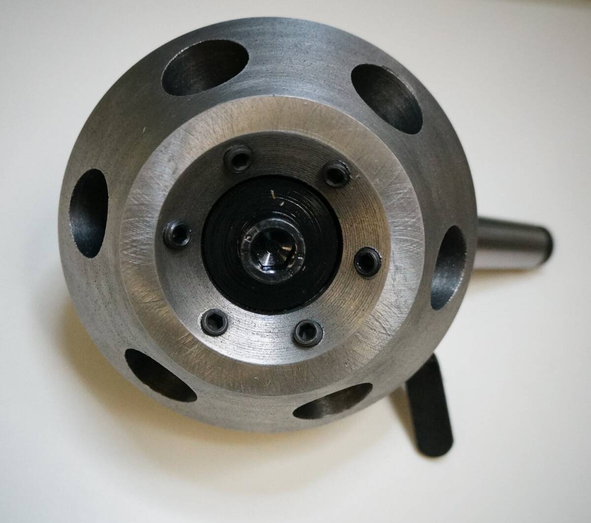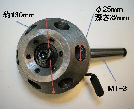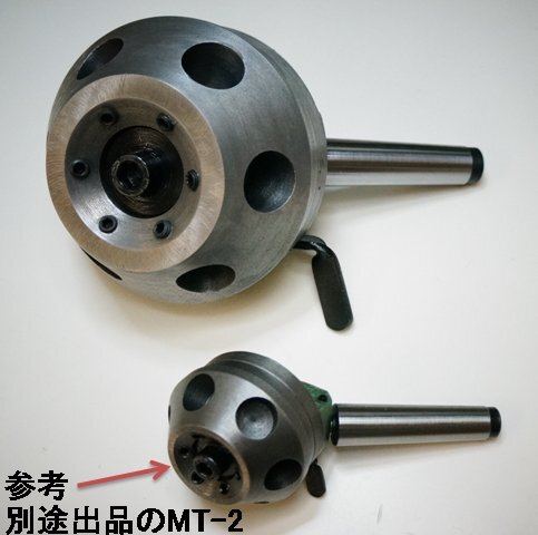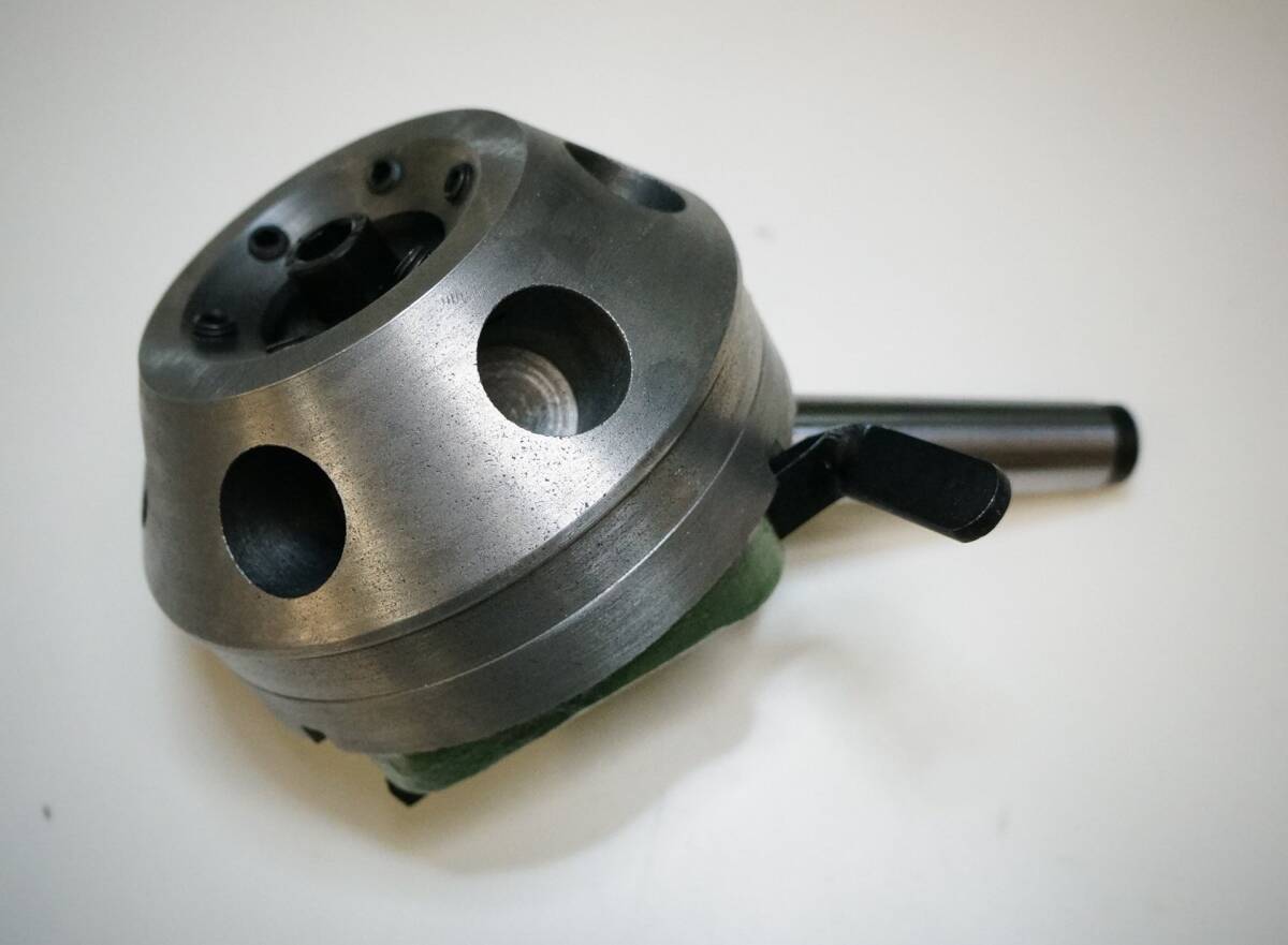 ☆芯押し台用大型ターレットMT-4 のいずれか1個の価格です。 ★ジャンク ヘッドをロック状態にしても、僅かにヘッドが動きます。 6個の切削工具、ドリルチャック、センターが取り付けられ、ワンタッチで切り替えが できます。 ボーリング、タップ、ダイス作業などで、同じ物を複数作る時に、一々切削工具を 取り替える必要がありませんので、格段の効率アップがはかられます。 レバーを押してヘッドを回すとカチッと隣のセットに移ります。 ヘッドセンターの六角ボルトでロックすることもできます。 ・シャンクテーパー : MT3またはMT4 ・ヘッド径 :5インチ ・ツールソケット :25mm ・ツールソケット数 :6口