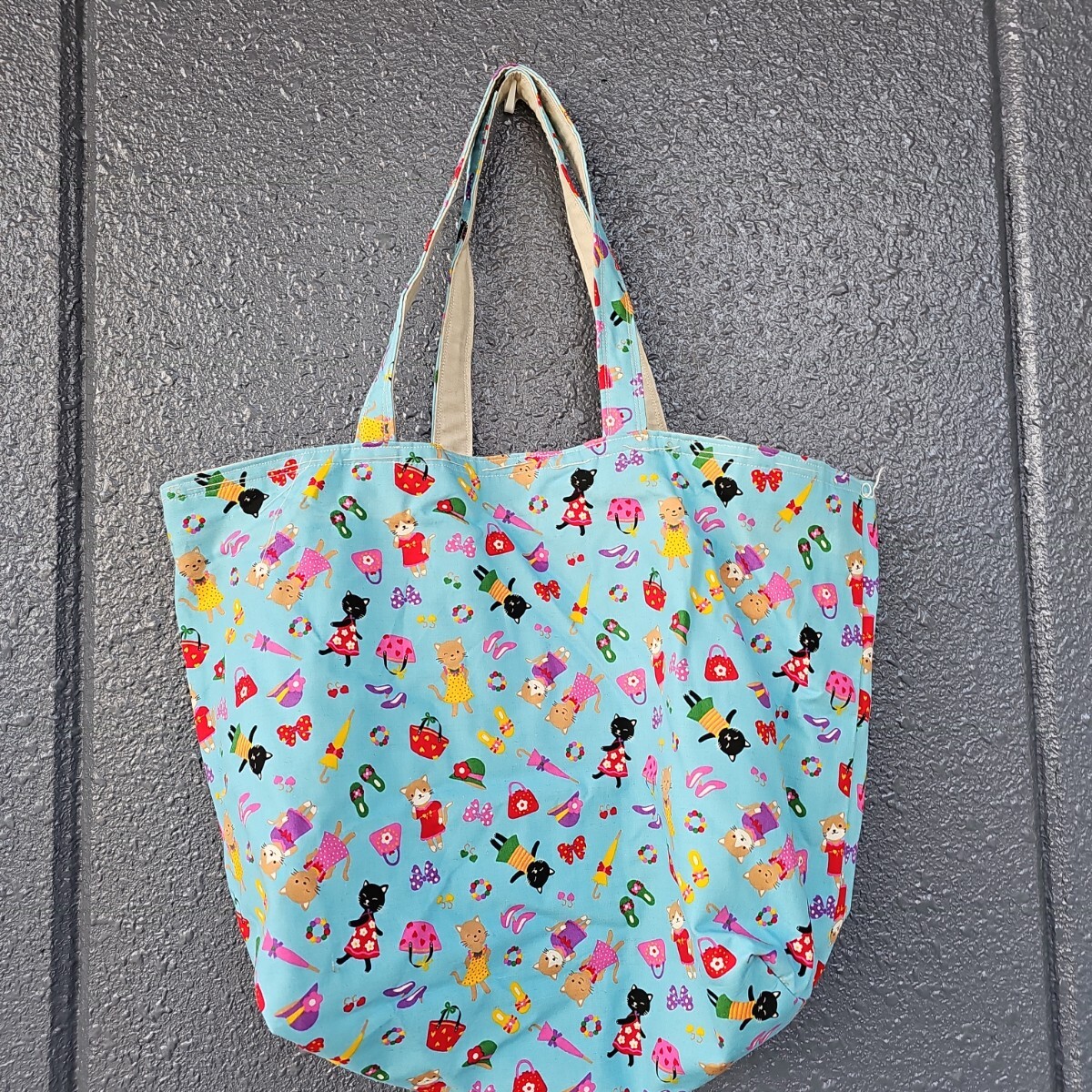 サイズは、高さ30cm、横 上部47cm、底部30cm、マチ15cm、ヒモ50cmです。