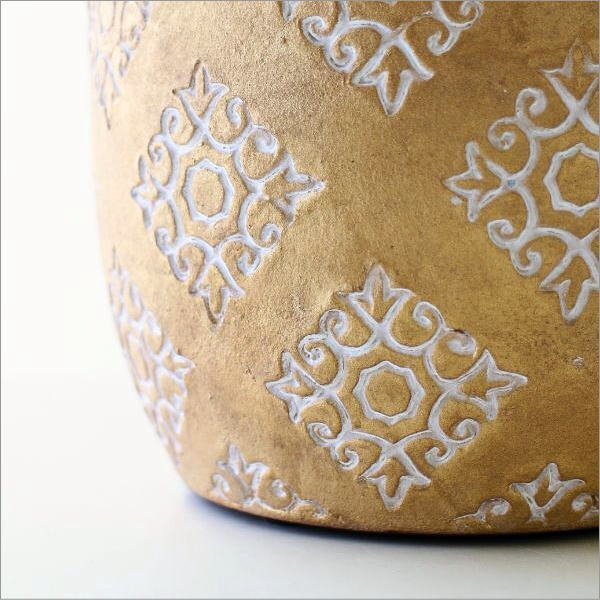 | レッドクレイ(赤粘土)を高温で焼き上げ 釉薬を何度も塗り重ねて仕上げる テラコッタ製のベースです 独自性、創造性をテーマにした 独特な柄や色合いは ハンドワークによるもので 凝った作りになっています 気軽に使える大きさの 上品なイメージの花瓶は 八角形をベースにした アラベスク調の型押し模様が綺麗に並んだ 凛とした佇まいが魅力です 商品名 : 陶器のベース MOROSアラベスク 商品番号 : sik5571 全体サイズ(cm) : 直径15×高さ26 材質 : 陶器(テラコッタ) 重量 : 2kg 生産国 : フィリピン ※防水加工が施されていますが水を長期間貯めたままにしないでください ※手作り品の為、模様・形・サイズ等に個体差があります ※商品の特性上、小さな欠けや傷はご容赦ください ※ディスプレイによる色の違いはご了承下さい |