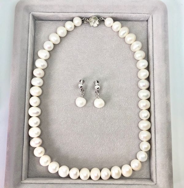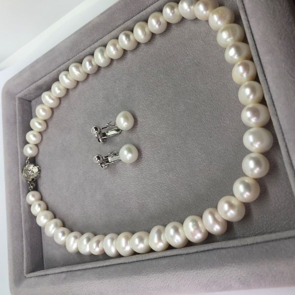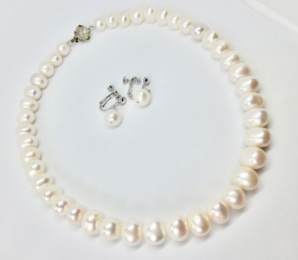 品名: ホワイト系セミラウンド型の淡水パールネックレスとイヤリングのセット商品です。 イヤリングはスイングタイプのデザインです。 こちらパールは真珠特有のくぼみや凹凸がございます。