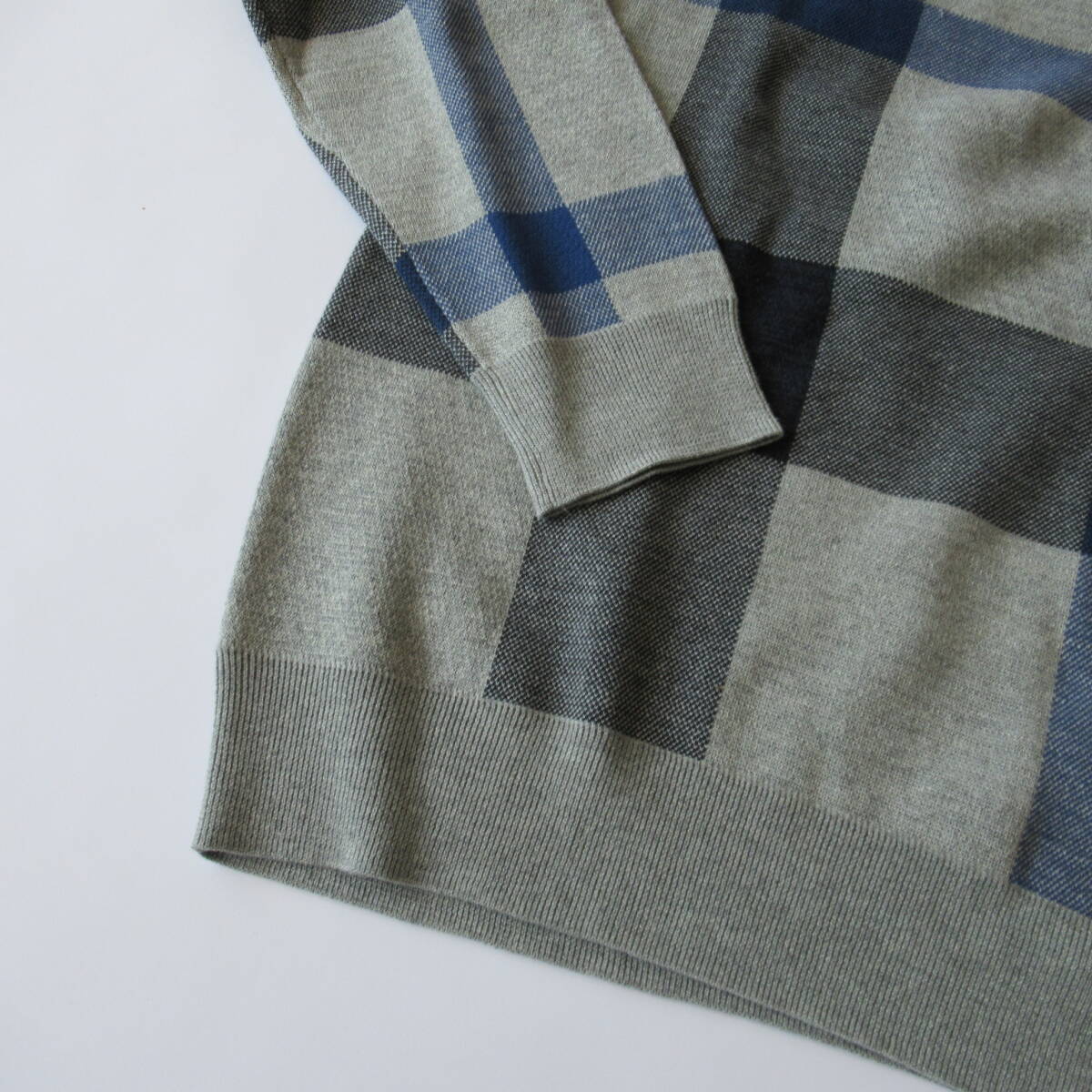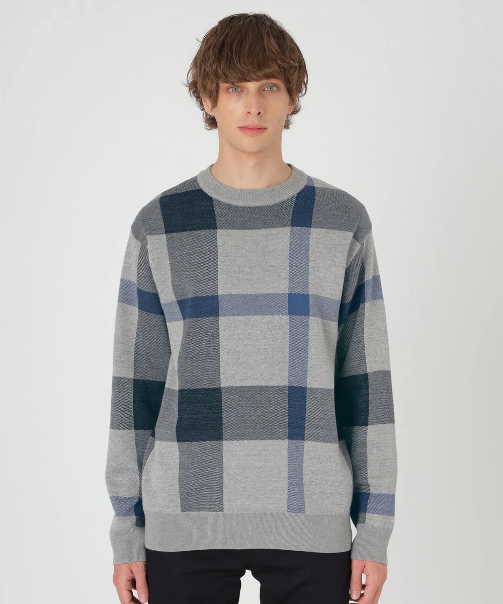 全面にチェック柄をあしらったアイコニックなクルーネックニット。全面にビッグスケールのクレストブリッジチェックをジャカード編みであしらったクルーネックニット。目を惹くアイコニックなチェック柄により一枚ではもちろん、インナーとしてもスタイリング映えする一着に仕上がっています。