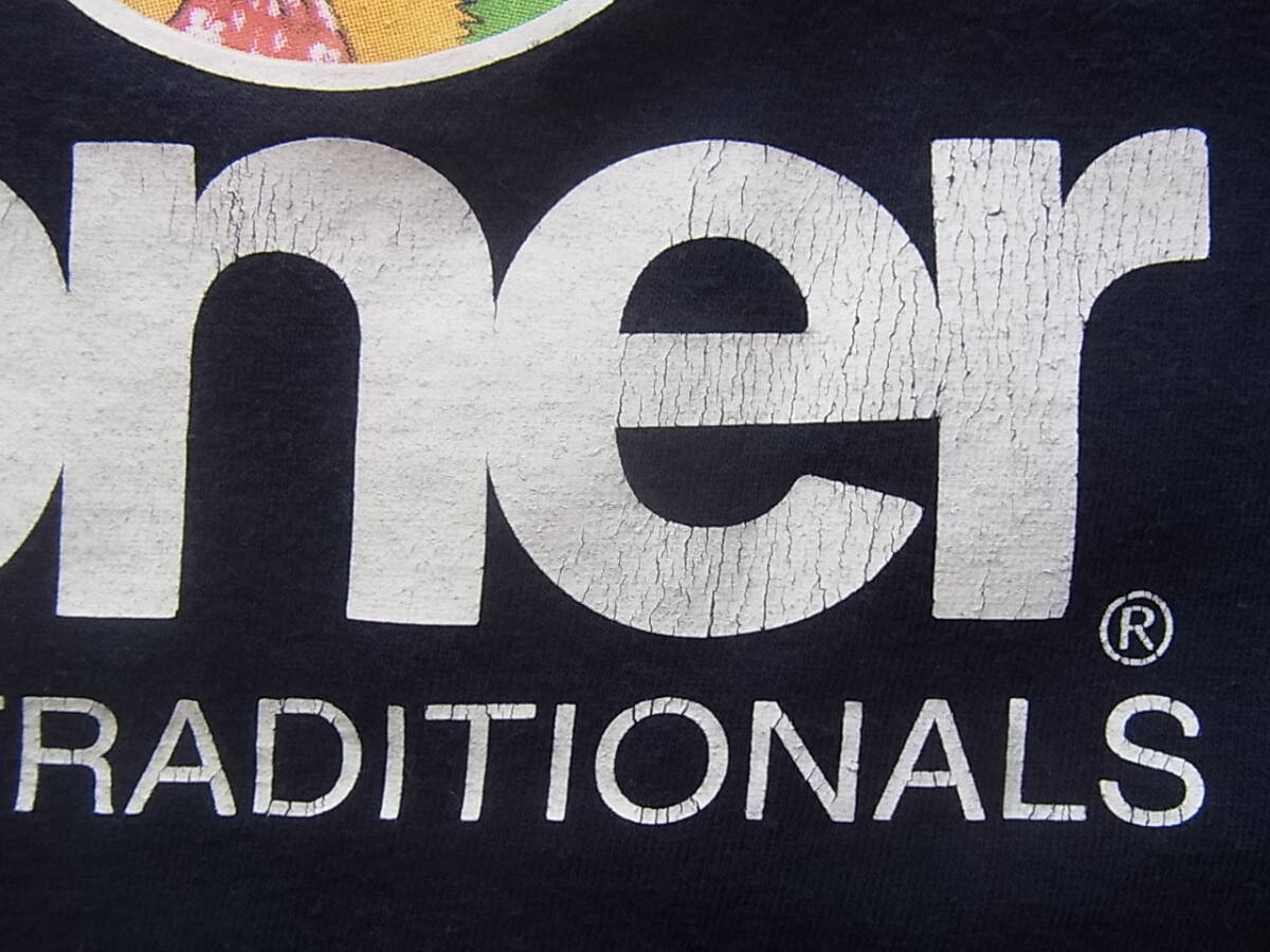 レイン スプーナーのボーイズサイズで前後プリント入りのTシャツになります。USEDで着用感と、画像の様にプリント部分にひび割れが御座います。それ以外には特に目立ったダメージ等は御座いません。