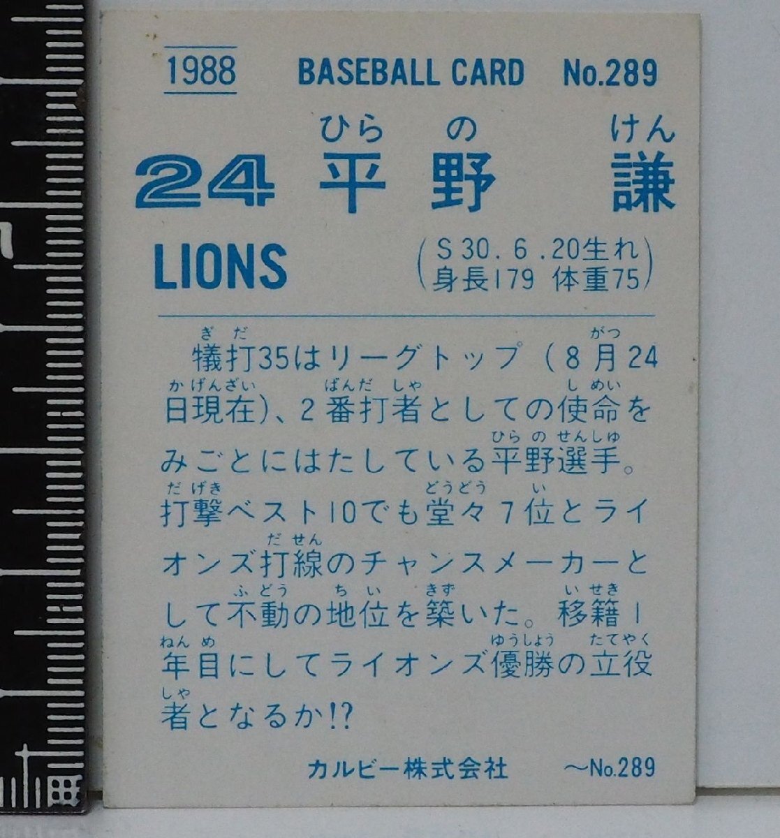 88年 カルビー プロ野球カード No.289【平野 謙 西武ライオンズ】昭和63年 1988年 当時物 Calbeeおまけ食玩BASEBALL【中古】送料込