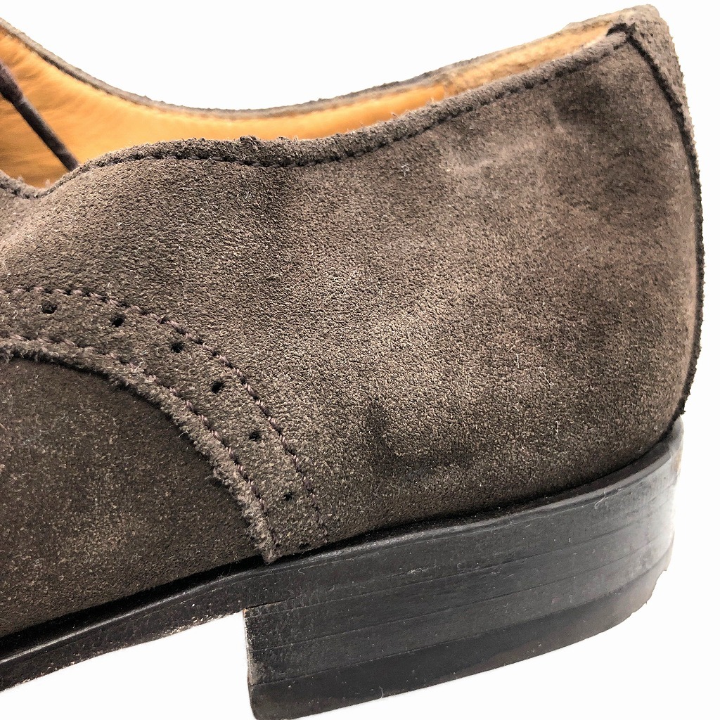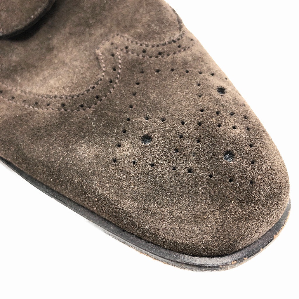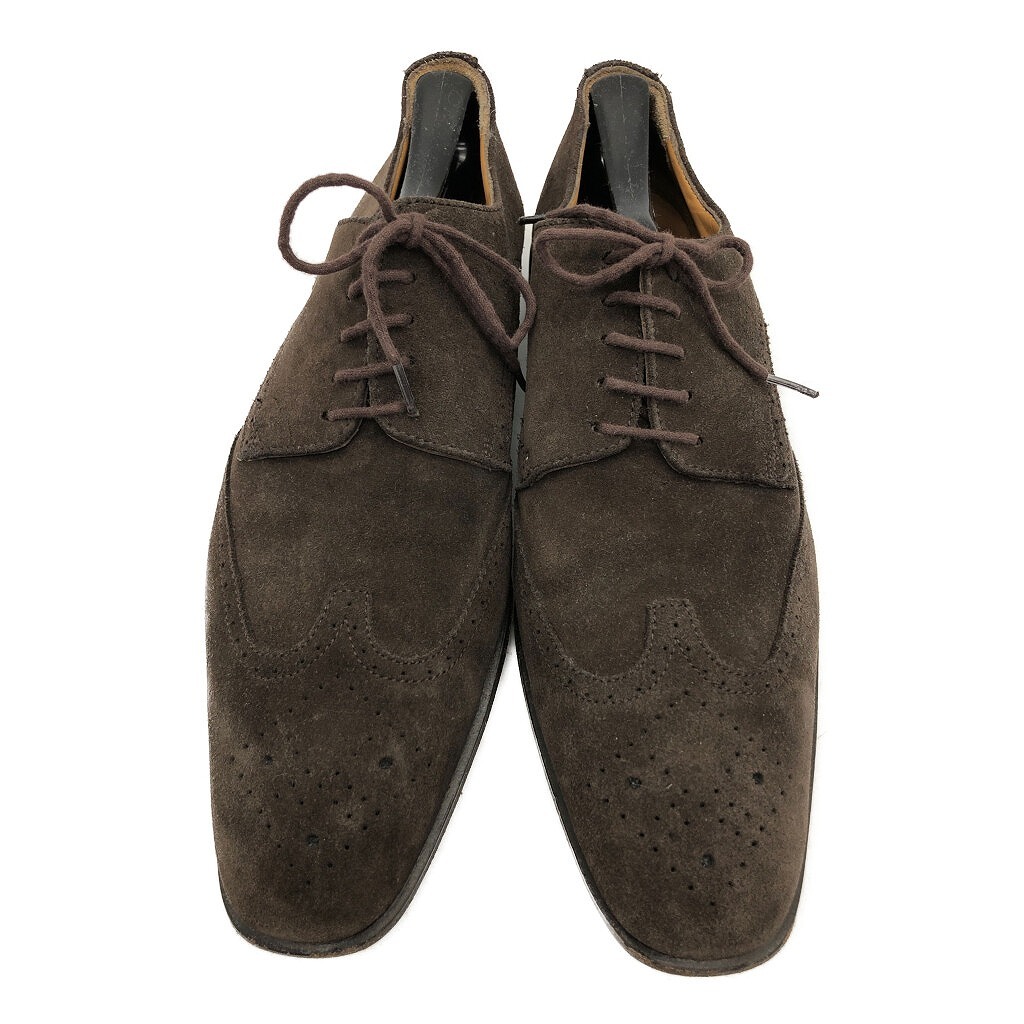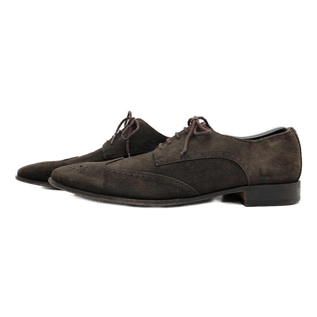 | [商品管理番号] KA0951 [サイズ] 9 1/2 [実寸サイズ] (アウトソール)全長:約32cm 最大幅:約10cm 最小幅:約6.5cm ヒール高さ:約2.5cm [主な素材] [色] ダークブラウン [仕様] ウィングチップ [状態] キズ: つま先、かかと周り、コバ全体的にスレあり 特記事項: 両足ヒールの減りあり | |||