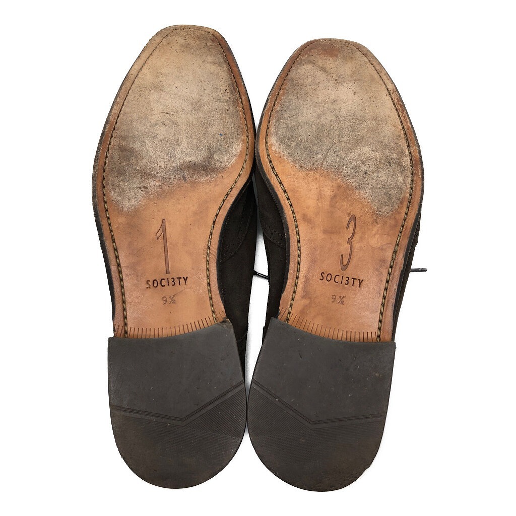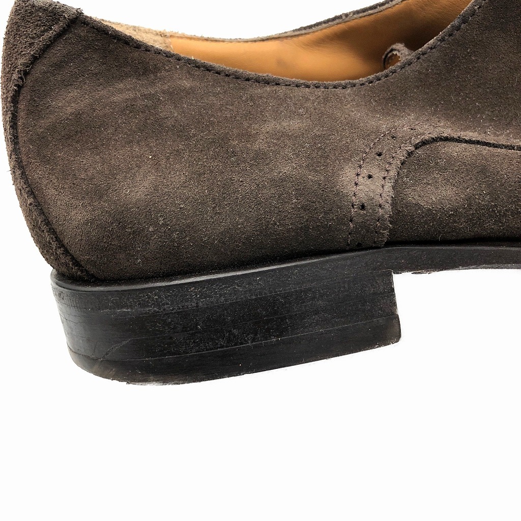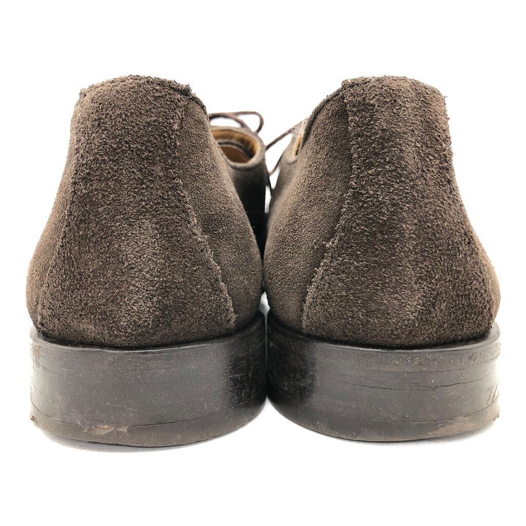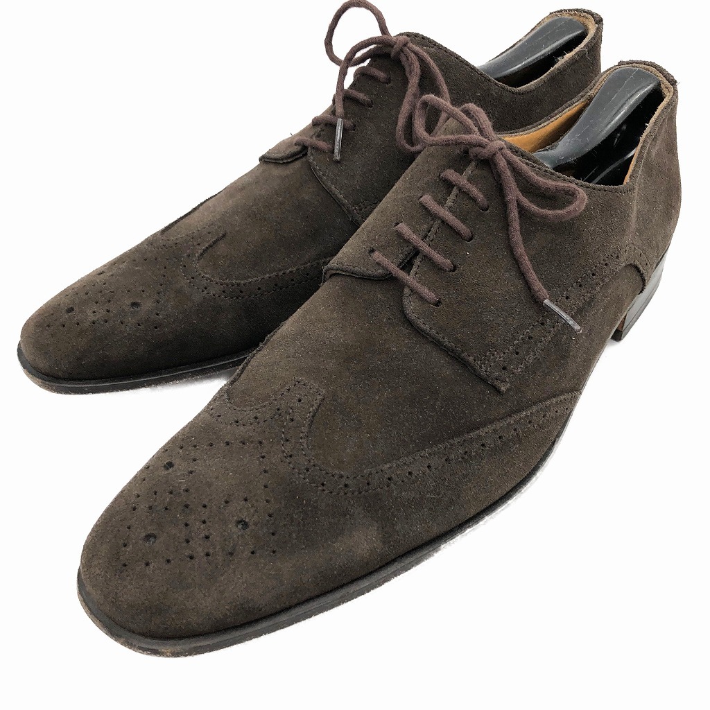 | [商品管理番号] KA0951 [サイズ] 9 1/2 [実寸サイズ] (アウトソール)全長:約32cm 最大幅:約10cm 最小幅:約6.5cm ヒール高さ:約2.5cm [主な素材] [色] ダークブラウン [仕様] ウィングチップ [状態] キズ: つま先、かかと周り、コバ全体的にスレあり 特記事項: 両足ヒールの減りあり | |||