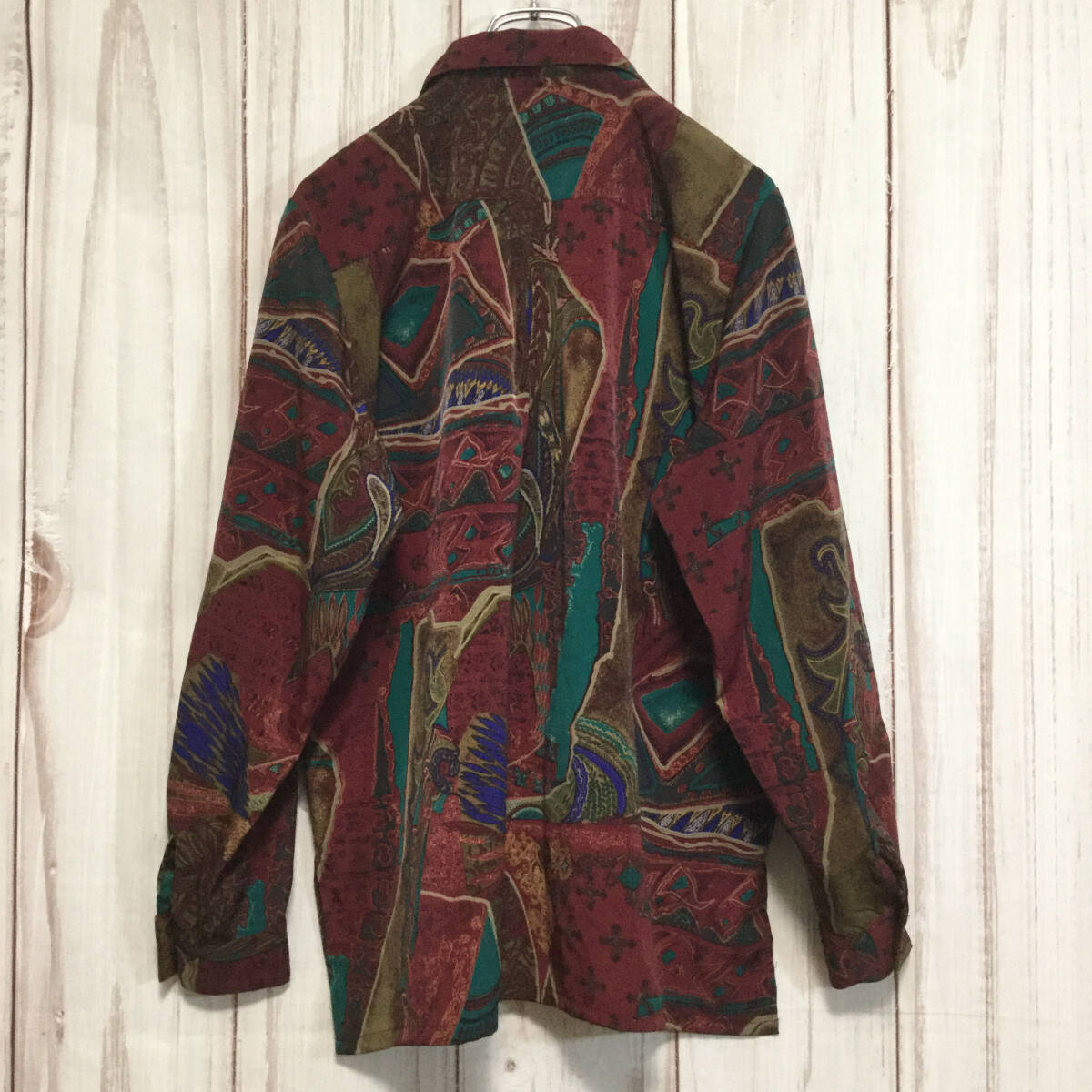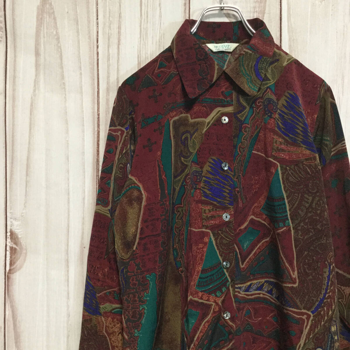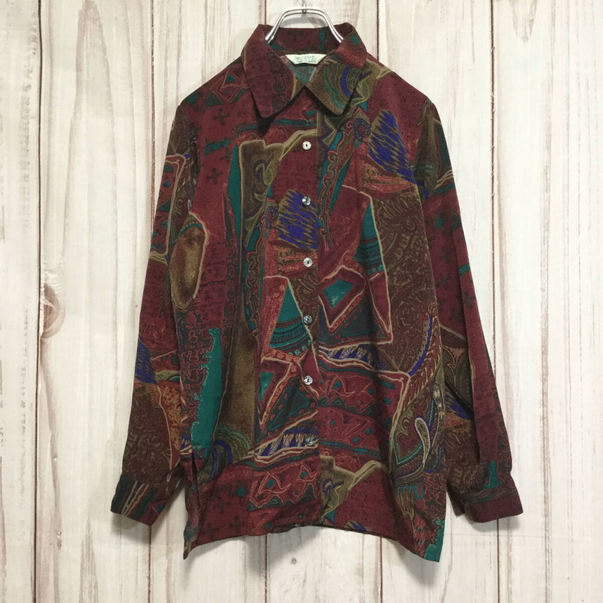 【昭和レトロ ヴィンテージ ペイズリー 長袖シャツ】 ダークカラー ヨーロピアン L相当 エンジ 古着 [231022-003]