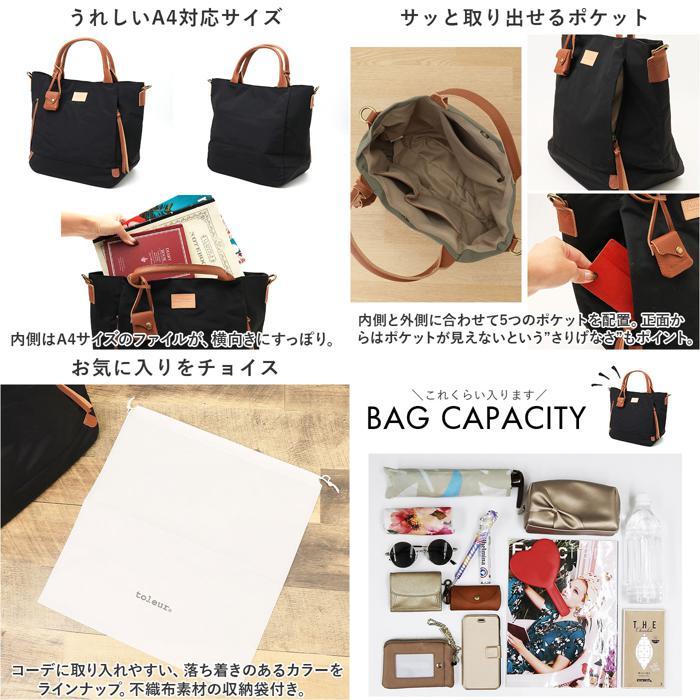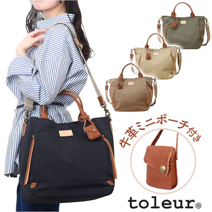 商品説明 | ・・大人の女性にぴったり♪デザイン性も使い勝手もばっちりな「toleur ナイロングログラン2WAYトート」が新登場。 ・【レザー使いがおしゃれ】 ・ハンドルや取り外し可能なミニポーチチャーム、引き手には自然な風合いの牛革を使用。カジュアルな中に、上品さをプラス。 ・【収納力があり、使い勝手ばっちり】 ・お出かけに必要な小物がすっきり収まるサイズ感。底に芯地を入れることで形崩れを防ぎ、ちょこっと荷物が重くなっても安心。 ・【持ち方を選べる2wayタイプ】 ・手持ちではもちろん!長さ調節可能なショルダーベルトを取り付けて、斜め掛けや肩掛けも。シーンやお好みに合わせてスタイルチェンジ。 ・【マグネットでワンタッチ開閉】 ・開口部はマグネット式で、簡単オープン!中身の飛び出しもガード。 ・【うれしいA4対応サイズ】 ・内側はA4サイズのファイルが、横向きにすっぽり。マチもあり、ペットボトルやコスメポーチ、お弁当箱なども収納可能。 ・【サッと取り出せるポケット】 ・内側と外側に合わせて5つのポケットを配置しており、小物が迷子になりにくい!正面からはポケットが見えないという”さりげなさ”もポイント。 ・【シーンを選ばず活躍】 ・お出かけや通勤、旅行などでも重宝。ちょっとおしゃれなマザーズバッグとしてもおすすめ。 ・【お気に入りをチョイス】 ・コーデに取り入れやすい、落ち着きのあるカラーをラインナップ。不織布素材の収納袋付き。 ・【toleur-トーラ-】 ・沢山の人にレザーを使ったバッグを持ってもらいたいという願いを込め、フランス語をもとに名づけたブランド。レザーを使い、ナチュラル感と使いやすさを兼ね備えた仕上がり。 ・【ポケット仕様】 ・内側:ファスナーポケット×1、オープンポケット×2 ・前面:ファスナーポケット×2 |