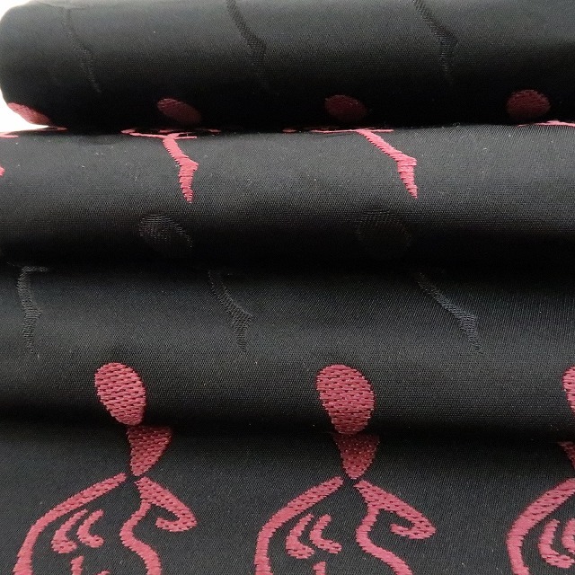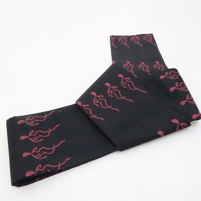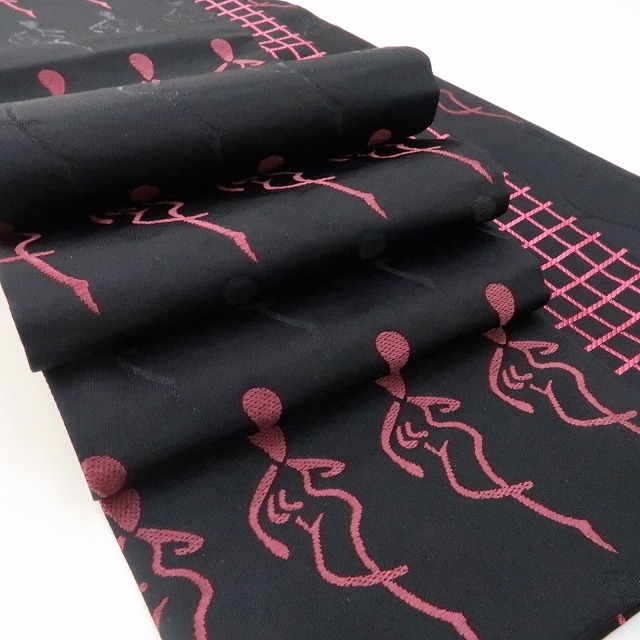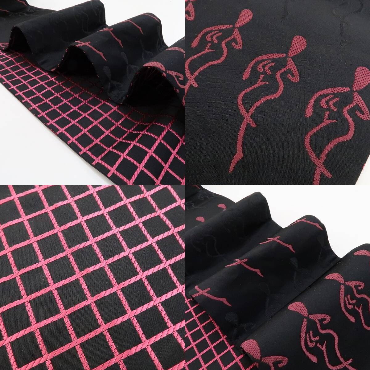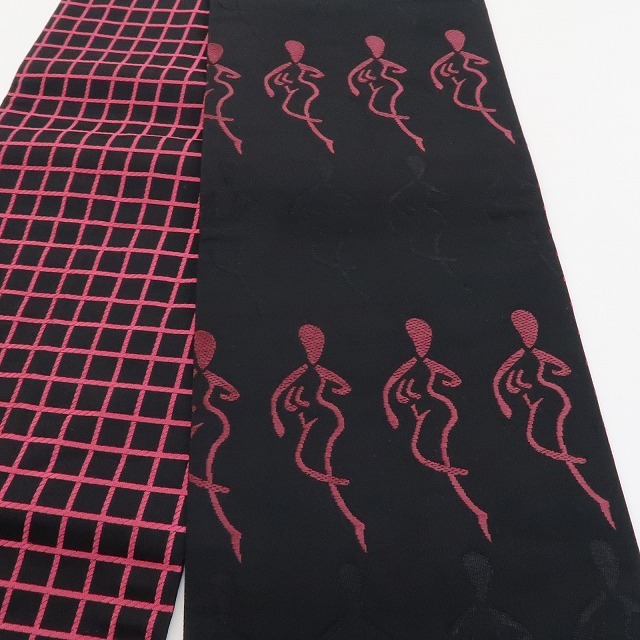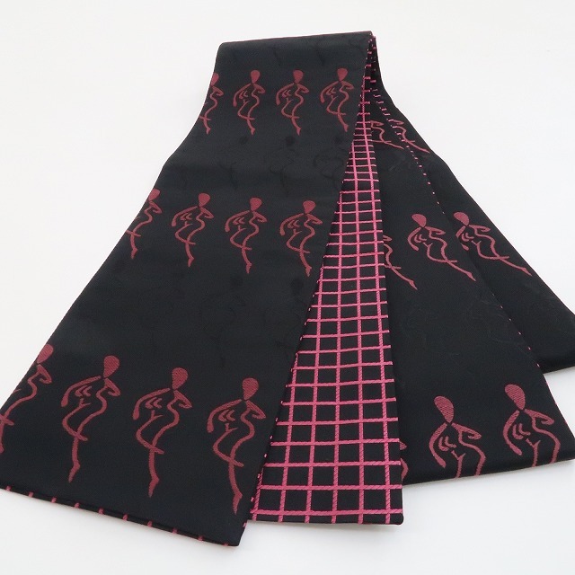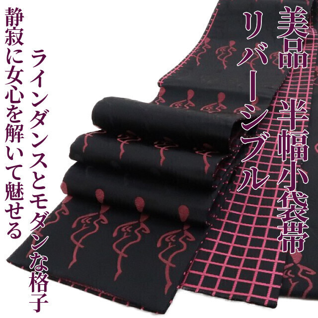 しなやかなシルエットで静寂に紛れ、一歩前に出てラインダンスをするかのように並びながら女心を解き、さり気なく周りと差をつける黒×梅紫色、その裏側では、黒×躑躅色で静寂を女心を解く色でぱっと照らし、見る角度で立体的に変化する格子を広げて定番ながらもどこかモダンな雰囲気を漂わせる、一本で二本の活躍を見せる“リバーシブル”半幅小袋帯です。