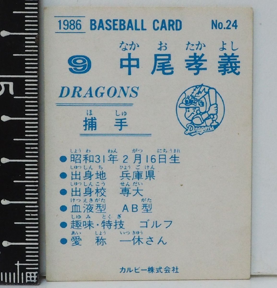 86年 カルビー プロ野球カード No.24【中尾 孝義 捕手 中日ドラゴンズ】昭和61年 1986年 当時物 Calbee おまけ 食玩 BASEBALL【中古】