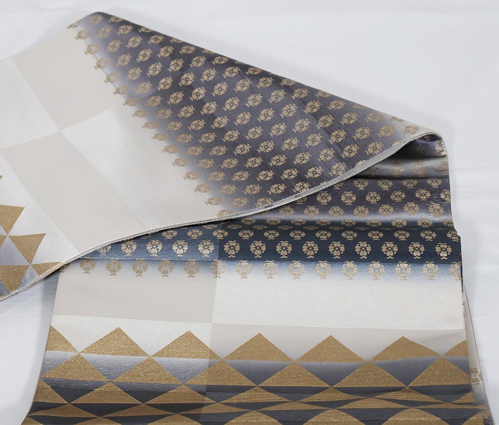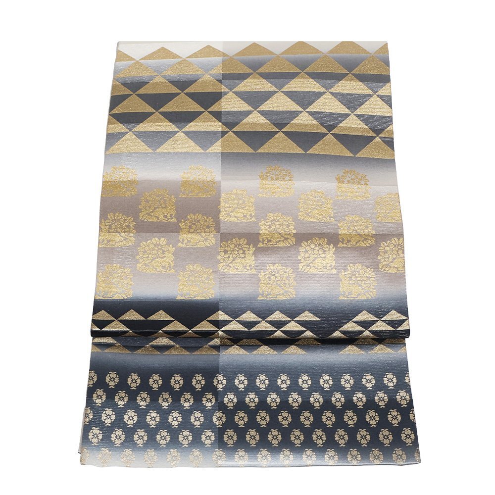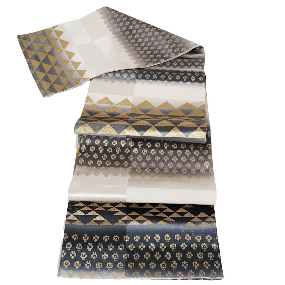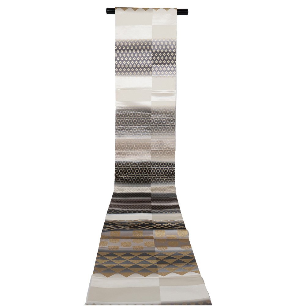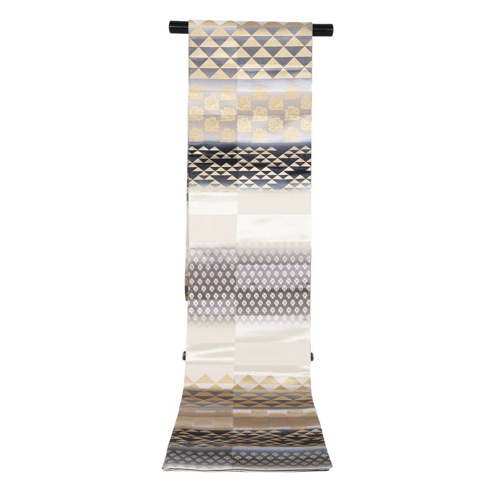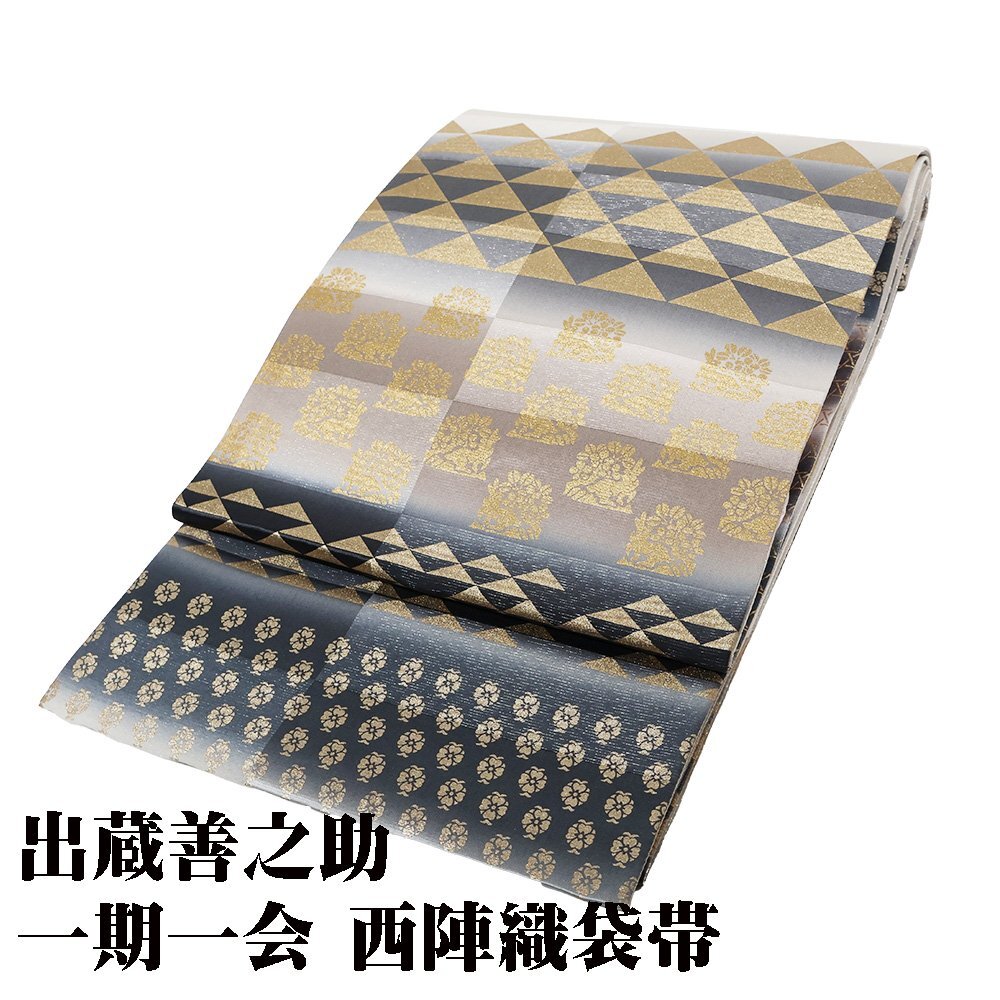 | 出蔵善之助 一期一会 西陣織袋帯 墨黒・金箔・グレー・オフホワイト・緑地 鱗文・花兎・花柄 新品 仕立て上がり |