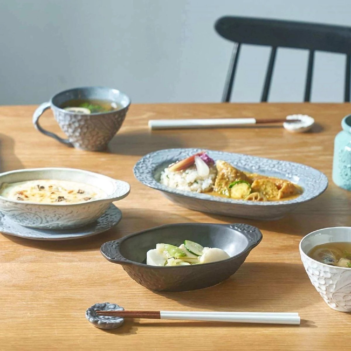 丁寧に1つ1つ作りこまれた美濃焼の箸置きと天然木の箸のペアセットです。丁寧にデザインされたレリーフの花模様としっとり落ち着いた色をお楽しみください。器の表面には花が浮き出ていて、底にも丁寧に花が彫られています。取っ手部分は葉っぱの形をしています。一点ずつ異なる美しい色味をした器は毎日使うのが楽しみになります。
