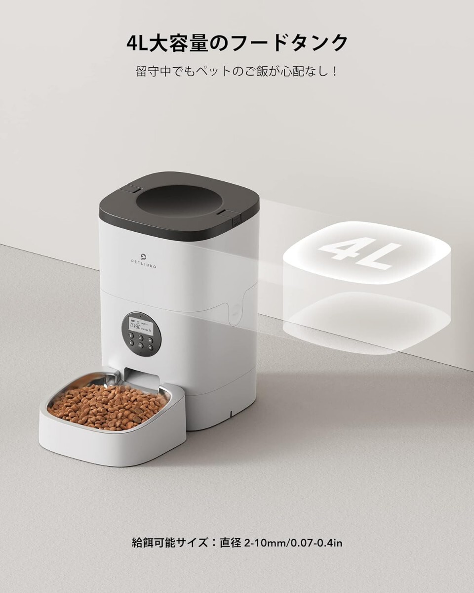 【4L容量 留守中対策】: PETLIBRO自動給餌器は、4Lの大容量タンクの採用で、1.4 kg程度の餌を入れることができます。仕事での残業で遅くなる日や出張、旅行、急な外出、朝寝坊などの時にペットの食事はこれ1台で心配なし!