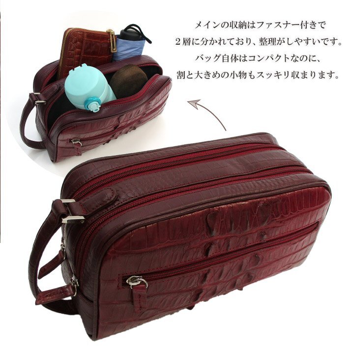 高級感あるクロコのホーンバックのセカンドバッグ 本物のクロコダイルのホーンバックを使用しています。 背中部分(ホーン)のゴツゴツと隆起した部分がワニ革ならではのワイルドな印象を演出します。 マット加工を施しており、落ち着いた上品さも兼ね備えています。 メインの収納はファスナー付きで2層に分かれており、収納するものを分類できるので整理がしやすいです。 バッグ自体はコンパクトなのに、割と大きめの小物もスッキリ収まります。 両面両側のファスナー付きフリーポケットはよく使うカード等を入れるのに便利です。 誕生日プレゼント・クリスマス・バレンタイン・父の日・母の日などの贈り物にも最適です。 ワシントン条約゛CITES(サイテス)“の規定に基づいて輸入された養殖のエキゾチックレザーを使用しています。 (CITES(サイテス)は本物の証明として発行されるものです) ※ご注意※ ・天然素材のため1点1点模様が異なります。柄でのお取替えはできませんので予めご了承の上ご購入くださいませ。 ・製造過程や入荷時期のより色合いなどに若干の誤差が生じる場合がございます。 ・商品の仕様、デザインは製品向上の為に予告なしに変更になる場合がございます。 ・ご覧のモニターやブラウザの設定、照明などにより、画像と実物の色合いが若干異なる場合がございます。 以上ご理解とご了承の上、ご購入をお願いいたします。 ■カラー:WINE ■素材:クロコダイル ■サイズ(約):横26cm×縦14cm×マチ10.5cm ■重量:約380g ■仕様:外側(メインファスナーポケット×2、ファスナーポケット×2)内側(ファスナーポケット×1) --革製品について-- ・製作過程により多少の傷、汚れ、縫い目が粗い、塗装にムラ、接着剤跡等がある場合がございます。 ・天然素材の商品は、自然由来の素材のため革には細かなシワや傷跡・トラ等が存在する場合があります。 ※シワなどは、動物の生育環境や年齢、個体によって異なる、革の特性です。 ・ご覧のモニターやプラウザの設定、照明等により、画像と実物の色合いが、若干異なる場合がございます。 これらについては予めご理解頂いた上でご購入お願いします。 | |