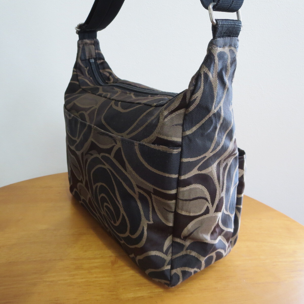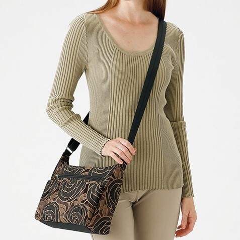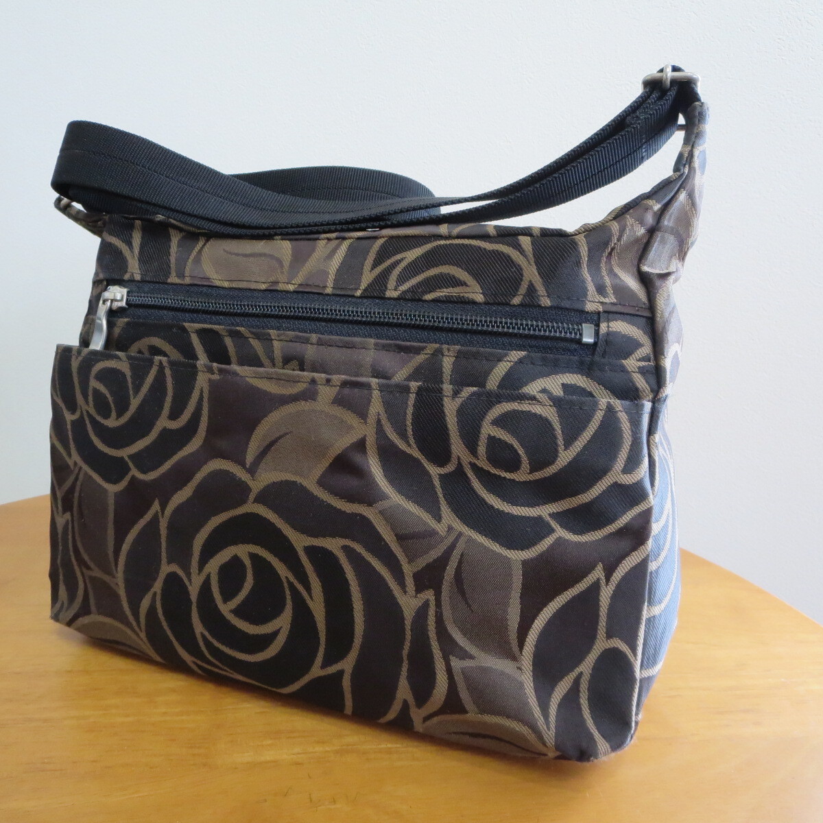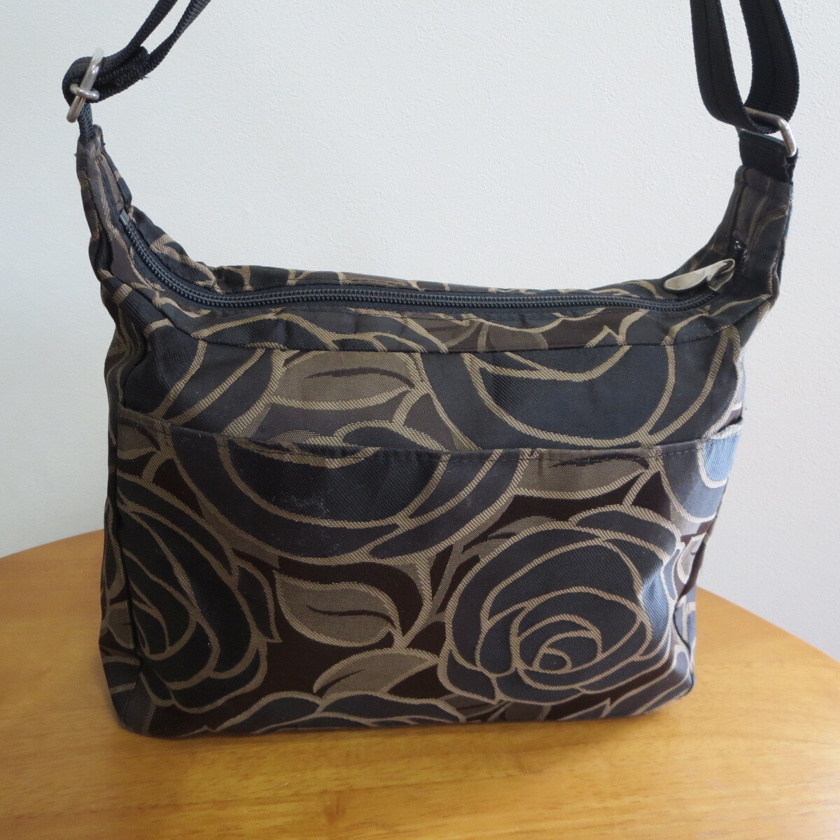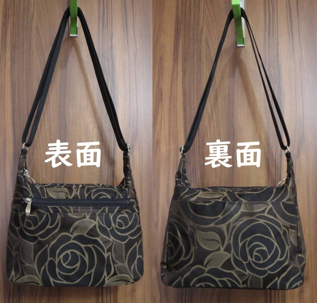 ブラックをベースにしたシックな色合いのバラ柄ショルダーバッグ。