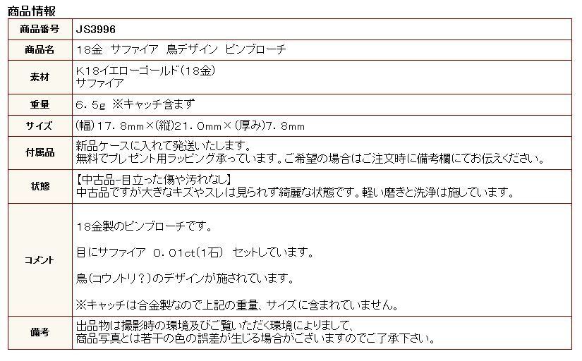 商品名 | 18金 サファイア 鳥デザイン ピンブローチ |