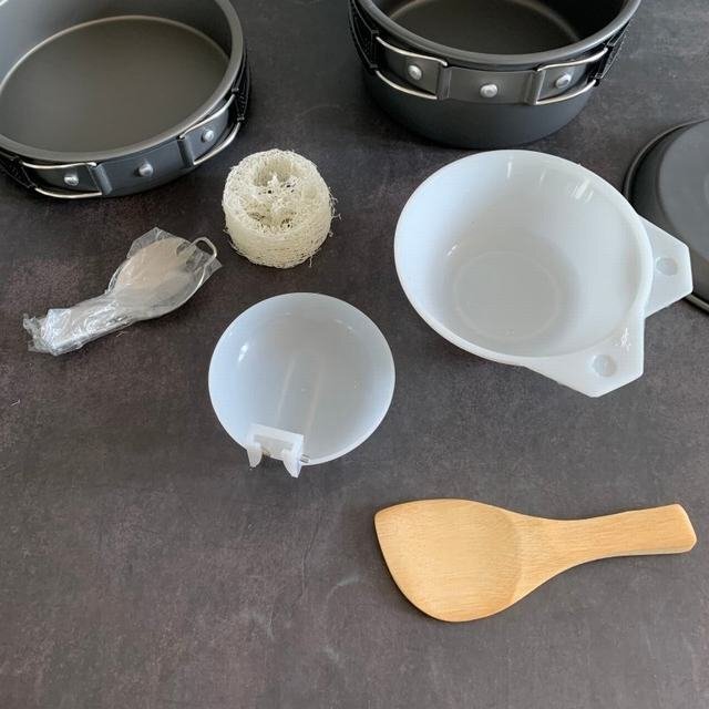 【 商品仕様 】 材質:アルミ 重量: 約500g 使用人数:1~2人 【 セット内容 】 鍋*1,フライパン*1,木製シャベル*1,食品レベルPPお碗*2,スポンジ*1,スプーン*1,フォーク*1,小さな布バッグ*1 【 防熱設計 】 防熱する為、シリコン材で作って蓋とハンドルカバーは、偶発的なやけどを防がられます、鍋を加熱した状態でも、ご安 心に利用いただけます。 【折りたたみ式 】 取っ手部分を折りたたんで重ねれば超コンパクトであるキャンプクッカーです。 【高品質 】 高温と重量に耐えることができる高品質のステンレス鋼で作られています。 【 多用途 】 家庭用にもアウトドア用にも適しており、キャンプ、登山、フィッシング、BBQ、大人気です。 【 携帯便利 】 折りたたむ腕がありますので、形体が小さく、軽量し、簡単に携帯します。小さな布バッグを付き、持ち運びに便利です。 【安全無毒】キャンプ用食器には食品グレードの素材を使用、高度な陽極酸化処理を施した超軽量アルミニウム材で作られています。熱伝導に優れたアルミニウムで高温や摩擦への耐久性を高めています。鍋の内部は焦げ付きにくく洗いやすいノンスティック仕様。 【滑り止め?断熱】キャンプクッカー樹脂タイプのハンドルカバーで調理中のやけどを防ぎます。すべり止め加工で安全性にも配慮した親切設計です。 【お手入れ簡単】焦げ付きにくいキャンプ用調理器具は、お手入れも簡単で乾きも早いです。 油汚れを拭き取ってからご自宅で洗うことができます。キャンプ用の食料品袋は、あなたのアウトドアの食事を簡単に、素敵で快適にすることができます。
