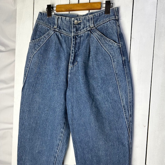 ●商品説明・・・アメリカ古着になります。80年代~90年代頃のオールド・ヴィンテージのデニムパンツです。股上深め(ハイライズ)のゆったりしたお尻・ワイドな太股周りから、裾にかけてテーパードしたレディースらしい丸みのあるシルエット感です。オールド物のしっかりしたミドルオンス程度のデニム生地です。素材はコットンです。サイズ表記はUSA 10で、L~XL程度のサイズ感かと思います。
