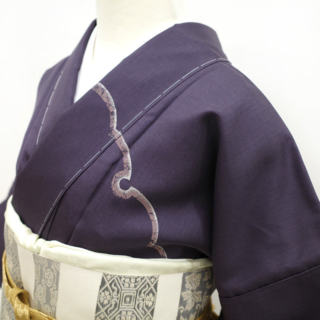 角度で見え隠れする花の地紋が施された、さらりとした紬地のこちらのお着物は粋な濃紫色。