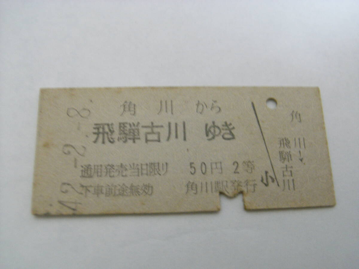 高山本線 角川から飛騨古川ゆき 50円2等 昭和42年2月8日 角川駅発行