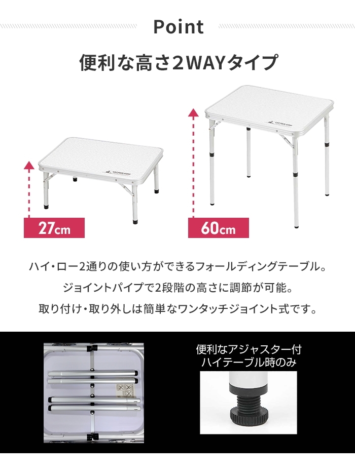 ハイ・ロー2通りの使い方ができるフォールディングテーブル。 テーブルは2段階の高さに調節が可能。 ジョイントパイプでハイテーブルに早変わり。 ジョイントパイプの取り付け・取り外しは簡単なワンタッチジョイント式。 天板裏側にジョイントパイプ収納用アタッチメント付。 ロータイプ使用時には取り外したジョイントパイプの収納に便利。 ジョイントパイプを外し、脚部を折りたたむだけのシンプルな構造なので組立・収納が簡単。 合板とアルミ脚を使用しているので軽くて丈夫。 天板裏とアルミ脚は補強付なので強度がアップ。 持ち運びに便利な取っ手付。 |