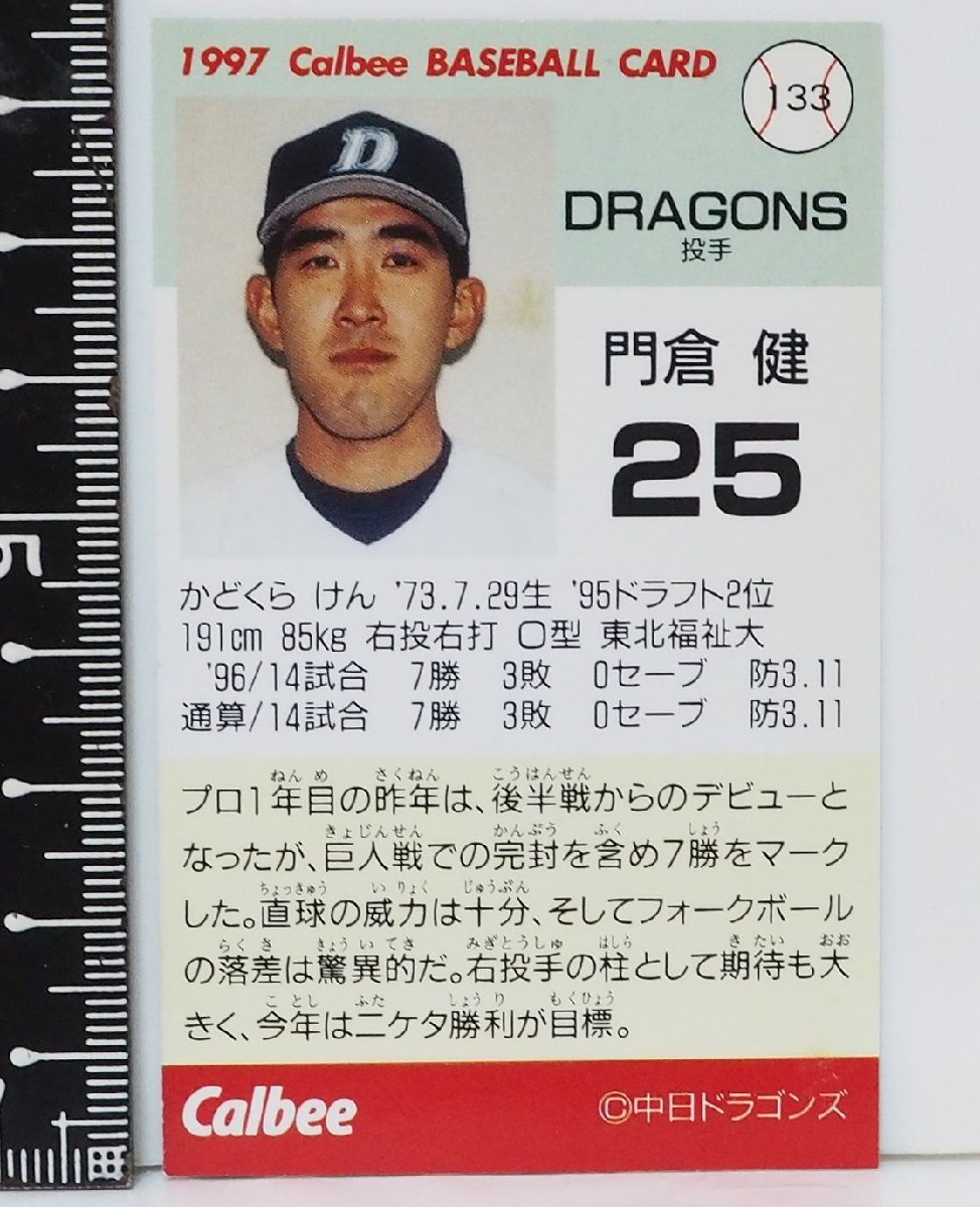 97年 カルビー プロ野球カード 133【門倉 健 投手 中日ドラゴンズ】平成9年 1997年 当時物 Calbeeおまけ食玩BASEBALL【中古】送料込
