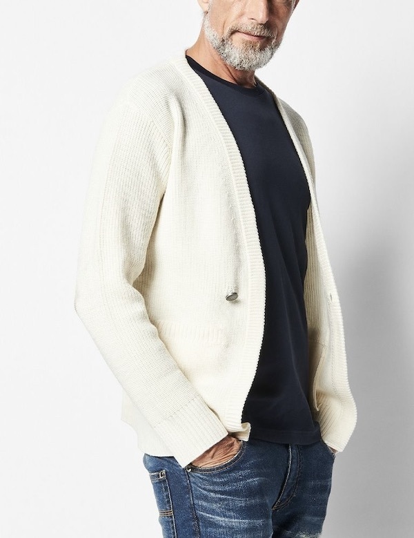1釦のダブル仕立てで釦を留めても、外してもどちらも様になる羽織のような、