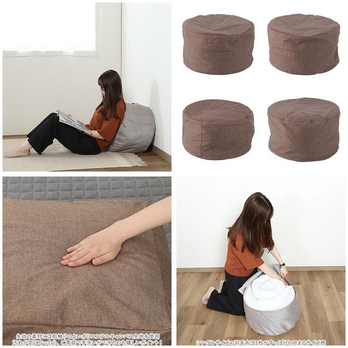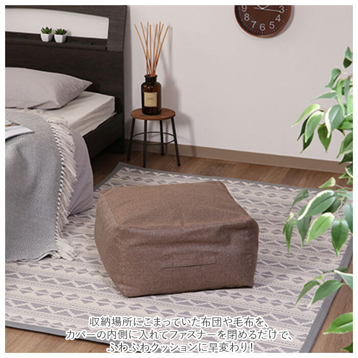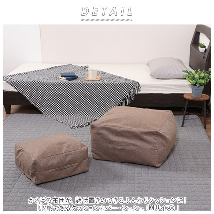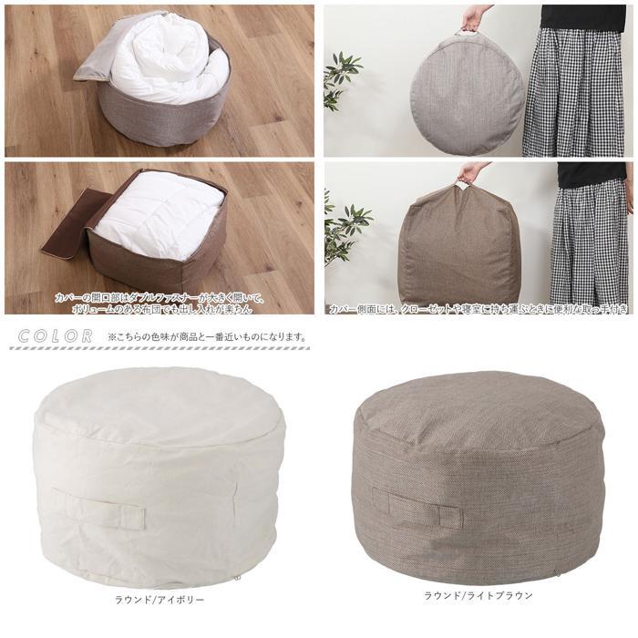 | 商品説明 | ・・かさばる布団が、魅せ置きのできるふんわりクッションに!「収納できるクッションカバー・シュシュ(Mサイズ)」 ・収納場所にこまっていた布団や毛布を、カバーの内側に入れてファスナーを閉めるだけで、ふわふわクッションに早変わり! ・シングルサイズの羽毛布団1枚がすっぽりと収まるサイズ感。カバーの開口部はダブルファスナーが大きく開いて、ボリュームのある布団でも出し入れが楽ちん。 ・ソファやフローリングの壁際に立て掛ければ、リラックス感のある背もたれクッションに。ローテーブルと合わせて、座椅子にしてもOK! ・カバー側面には、クローゼットや寝室に持ち運ぶときに便利な取っ手付き。 ・中に詰める布団の種類やボリュームに応じて、お好みの硬さに調節可能。少し硬めに調整すれば、ソファ前で足を載せるオットマンに♪ ・生地の素材には肌触りのよいポリエステルキャンバス生地を使用。汚れが気になったら、ご家庭で手洗いができるのも嬉しいポイント! ・コロンと丸いカタチが可愛いラウンド型と、きちんと感のあるインテリアを演出できるスクエア型、お部屋の雰囲気に合わせて選べる2タイプ。 |