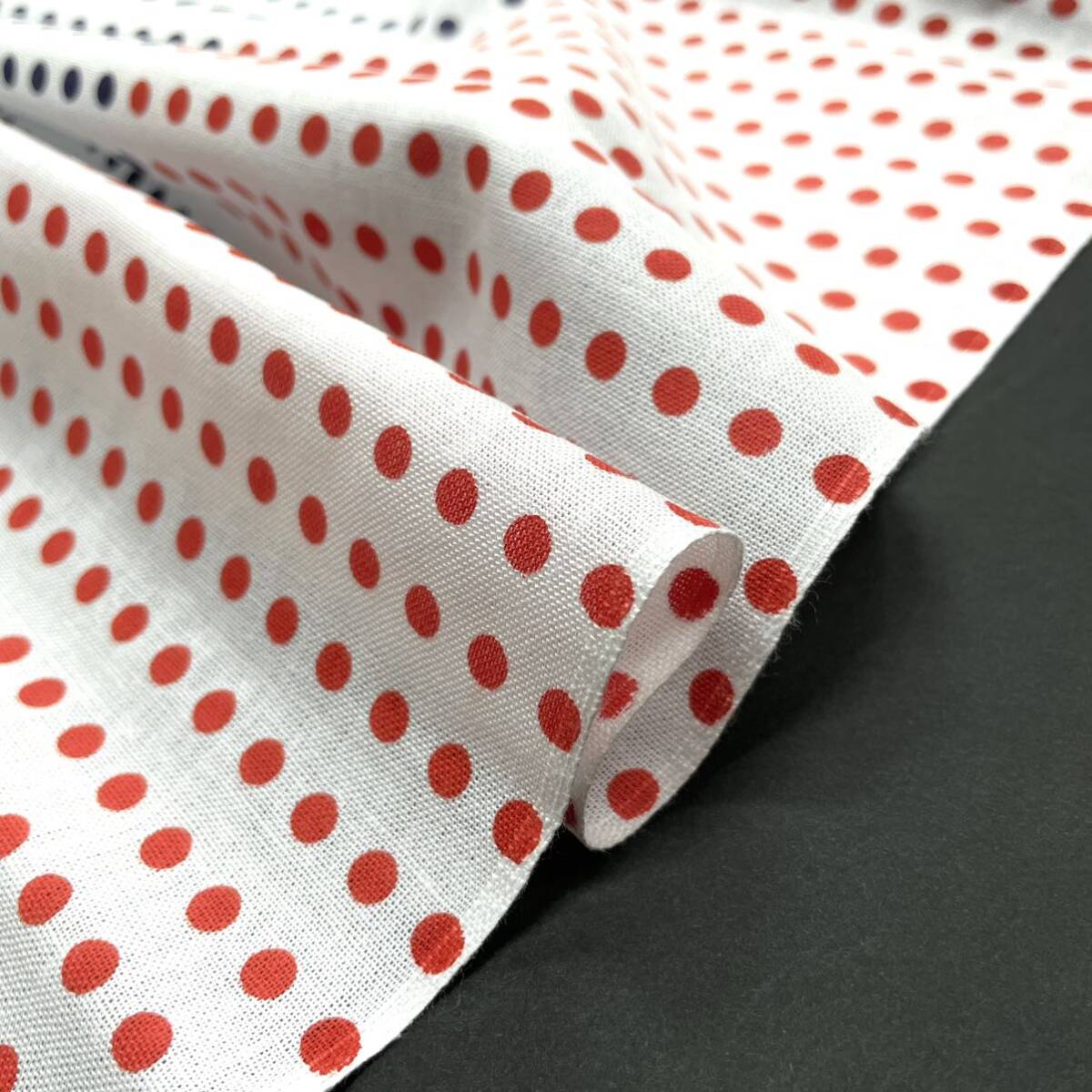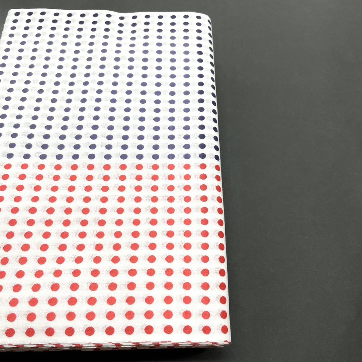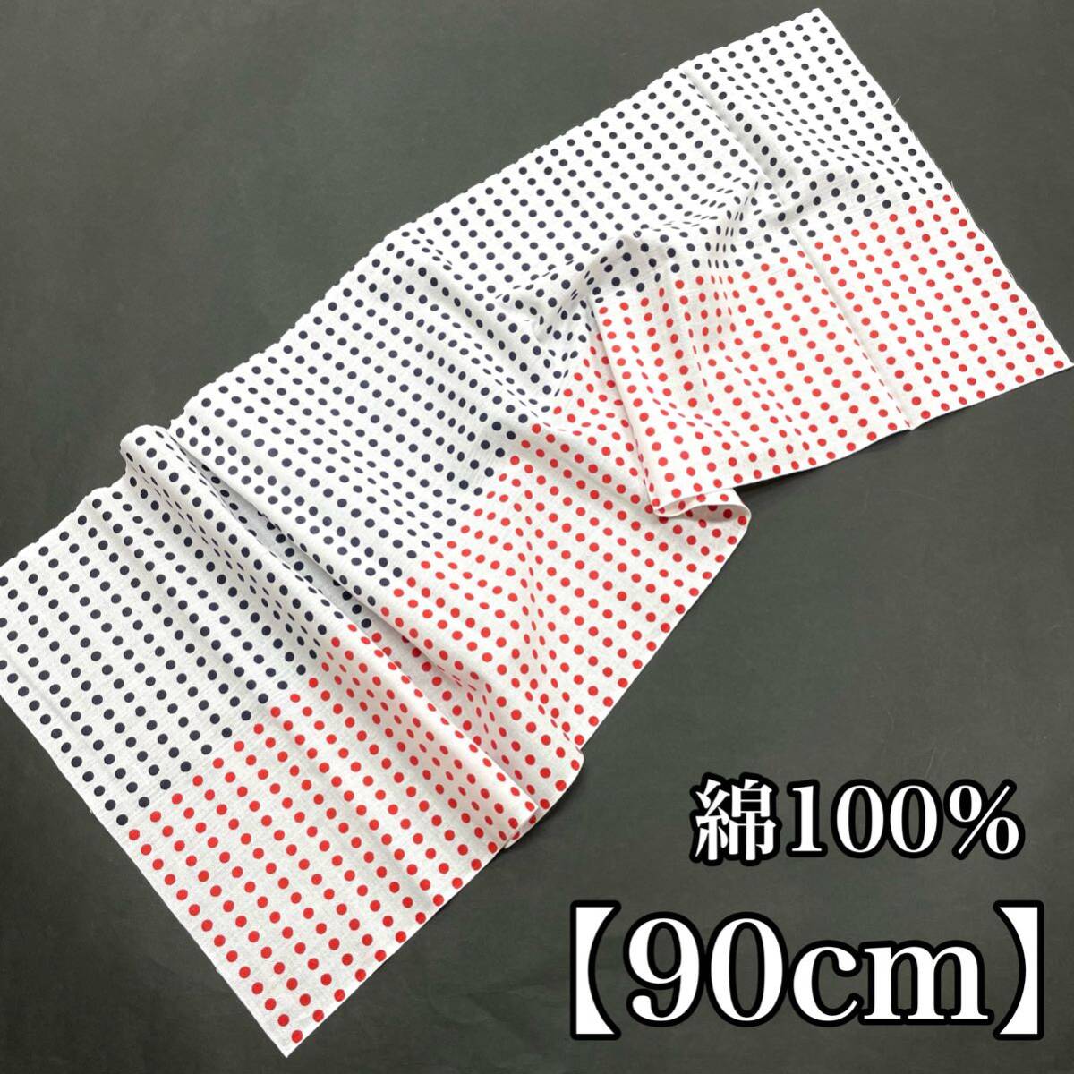 綿100%で白生地に赤と紺の水玉模様で、長さは大人でも子供でも使いやすい【約90cm】となっており、綿素材ならでは優しい手触りの手拭いとなっております。