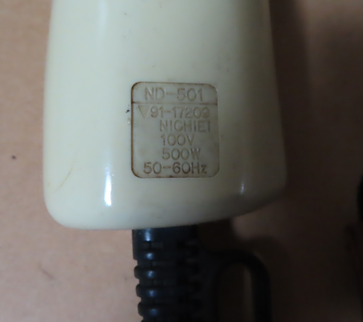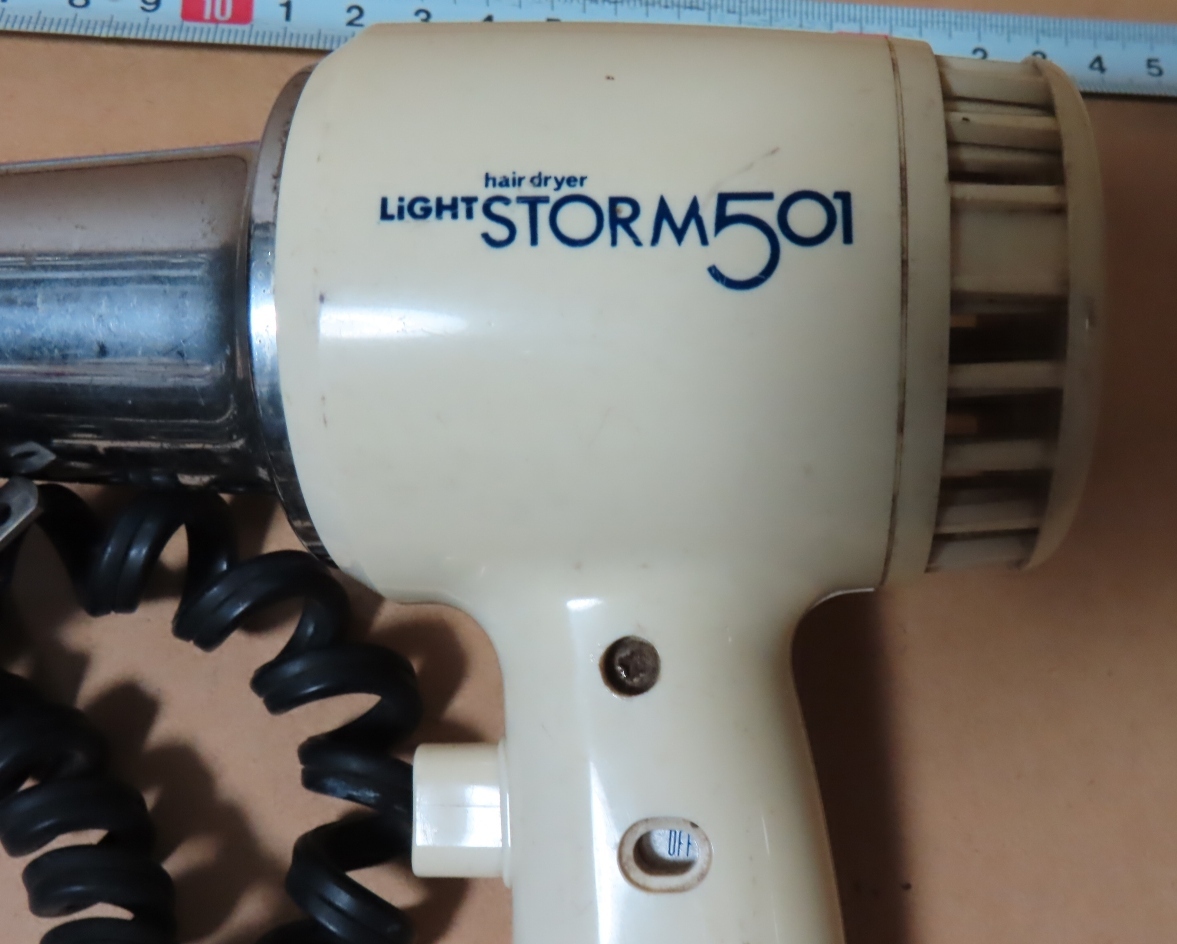 | 商品紹介 | 掃除したらでてきまいた。 品物は写真を参照ねがいます。 昔のドライヤーになります。 hair dryer LiGHT STORM501 とあり 持ち手部に 型番ND-501 NICHIEI とあります。 |