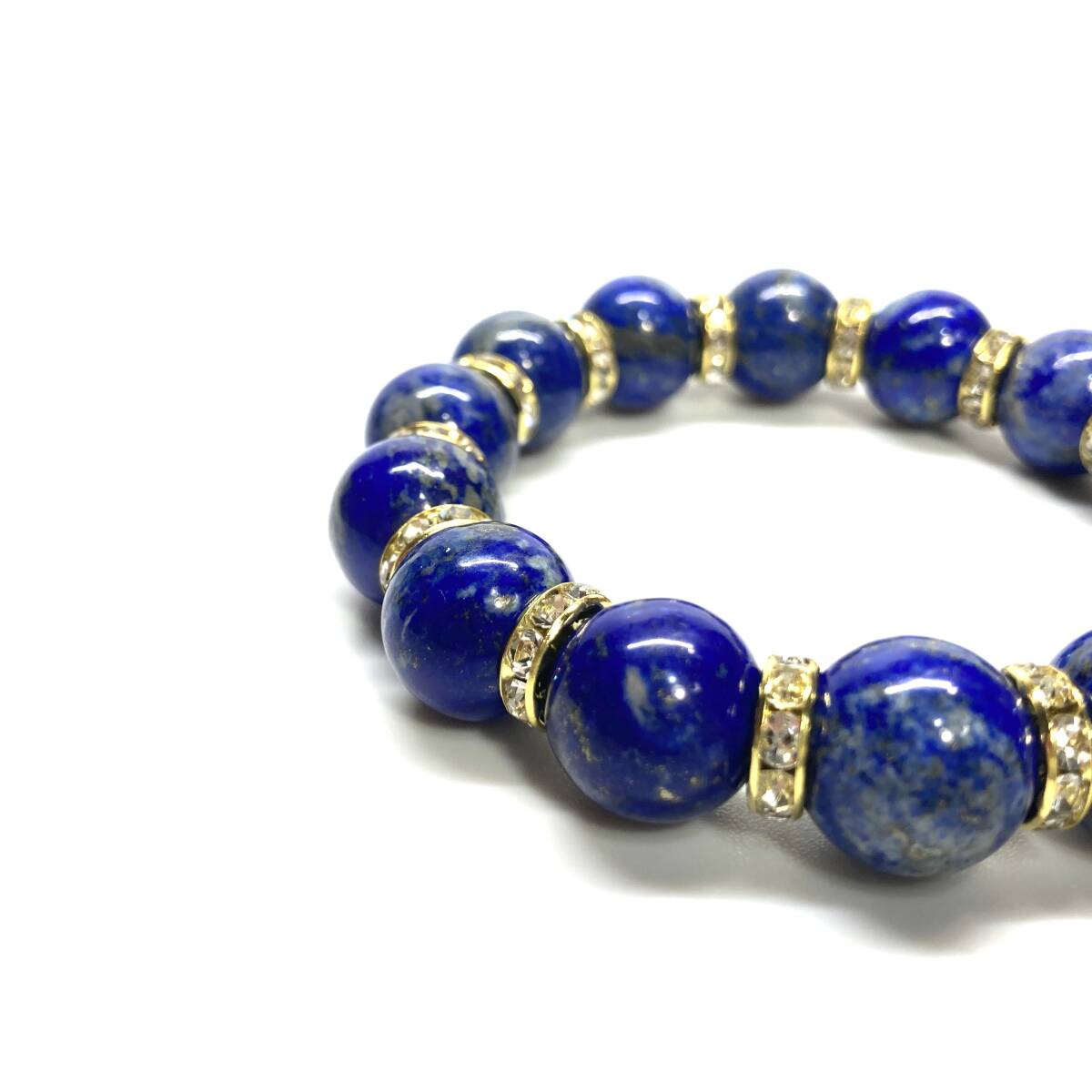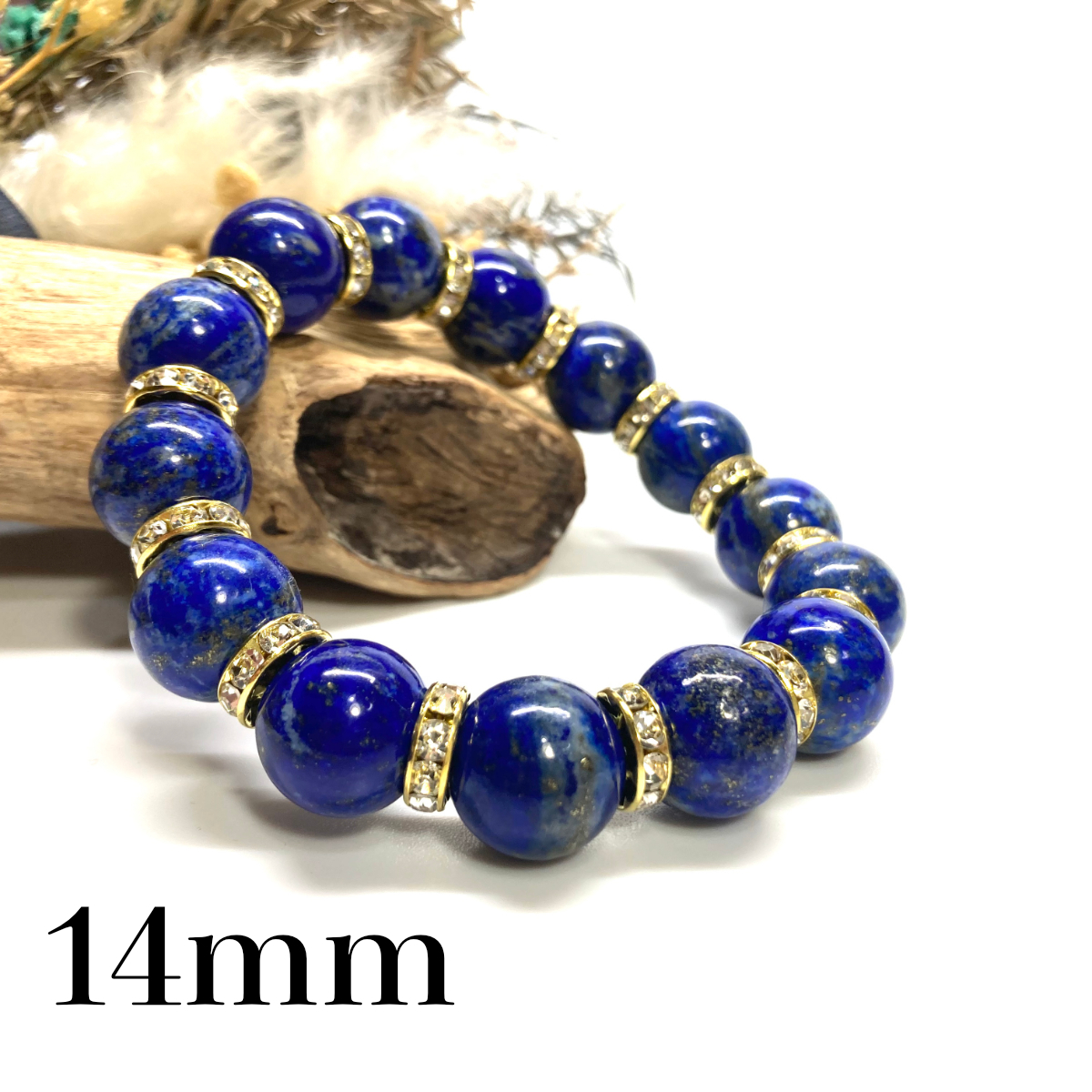 こちらは、14mm玉のラピスラズリを使用した天然石ブレスレットです。石との間にはロンデルを挟み高級感を演出しています。シンプルなデザインですのでどんなコーディネートとも合わせ易いブレスレットです。石大きさは14mm玉です。内周約17cmです。パワーストーンを付けてる方へのプレゼントにもお勧めです。14mmサイズのリクエストが多々ありましたので少量ですが販売しました。気になる方はお早めにどうぞ。