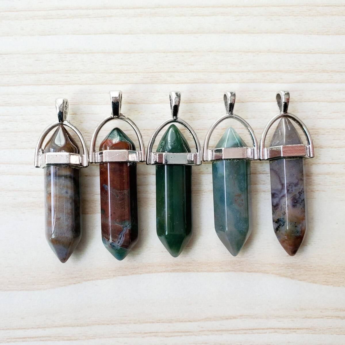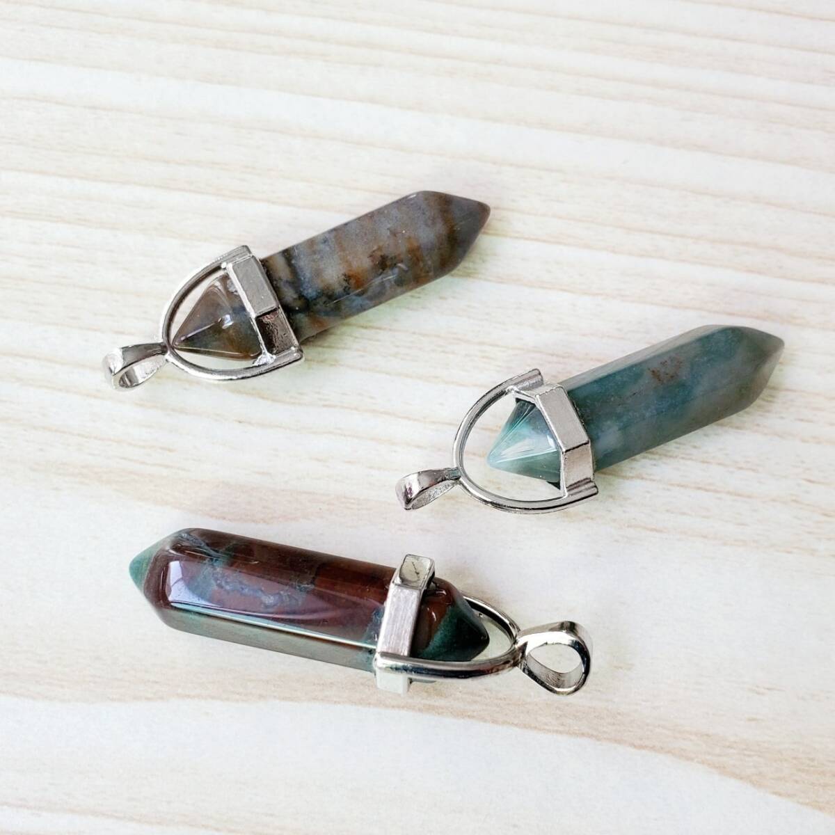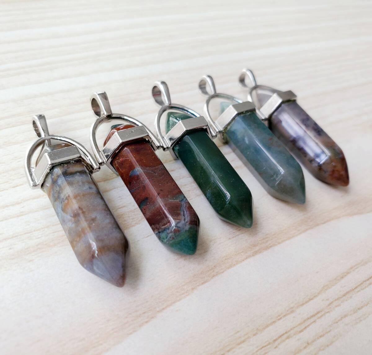 ◆商品名・・・【インド瑪瑙(アゲート)】ペンダントトップ5個セット *添付画像の物は実際にお送りするお品です。 ◆サイズ・・・石:縦3.2~3.3㎝ 横幅 約1㎝ 金具部分込み 全長約4㎝ 約4.5g/1個 ◆素材・・・天然石 ステンレス ◆天然石の為、含有物・小さなキズや欠け・微妙な色味の違いや模様の違い等がある場合がございます。予めご了承くださいませ。 金具部分はステンレスなので、さびにくい素材になっています。 ★☆他にも天然石ペンダントトップ出品中☆★ |