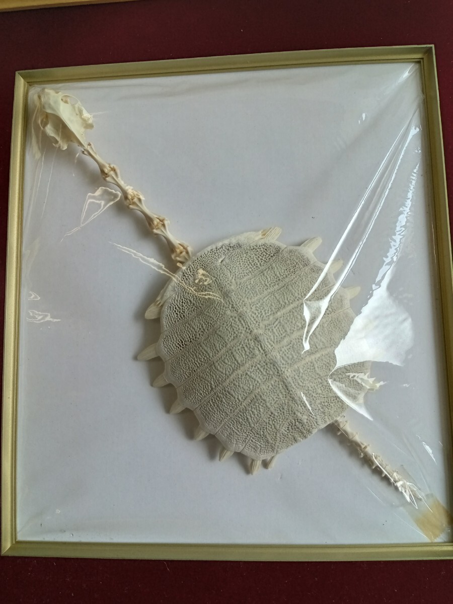 珍しいスッポンの骨格標的です。大きさは甲羅12cm、全長30cm。写真のように額に骨格を貼ったもので、ラップが被せています。