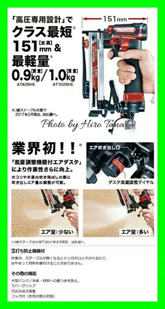 | 商品説明 | ◆軽量・コンパクト設計 ◆風量調整付エアダスタ搭載 ◆空打ち防止機構付 ◆大型パンパ・ラバーグリップ・フック付 ◆打ち込み深さ調整 ◆大型バンパ/本体・材料への傷つきを防止。 ◆ラバーグリップ ◆フック付(左右付替え可能) ☆機体寸法☆ 長さ251mm×幅69mm×高さ151mm 質量1.0kg ☆標準付属品☆ 油さし・セーフティゴーグル・六角棒レンチ3 定価¥37,800+税 |