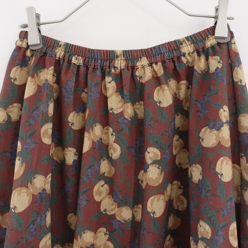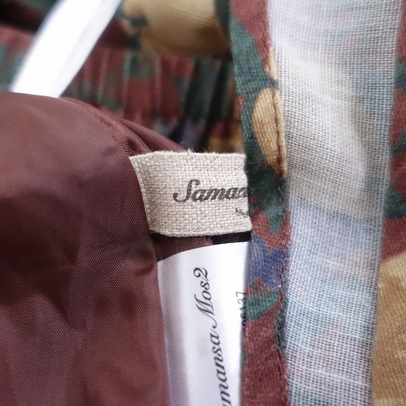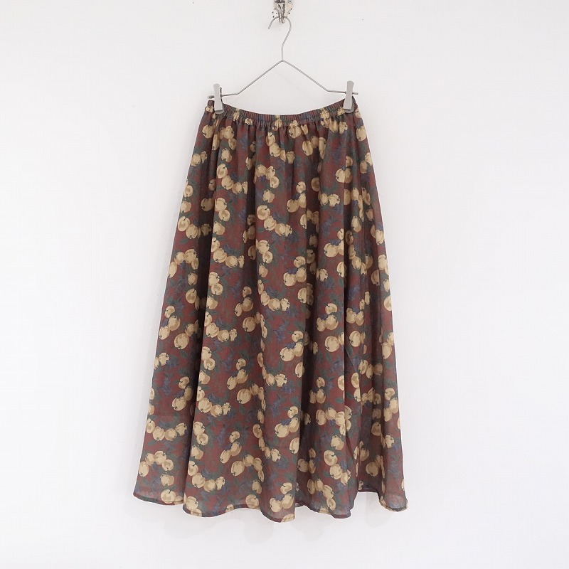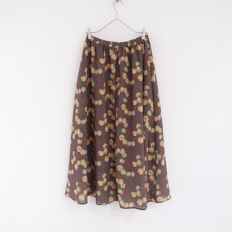 | Samansa Mos2 の総柄ロングスカートです。カラーはブラウン+ベージュ・グリーン・ネイビーなどで、薄手素材です。ウエストラインに平ゴムが通ったイージータイプで、ブラウンの裏地付きです。 |